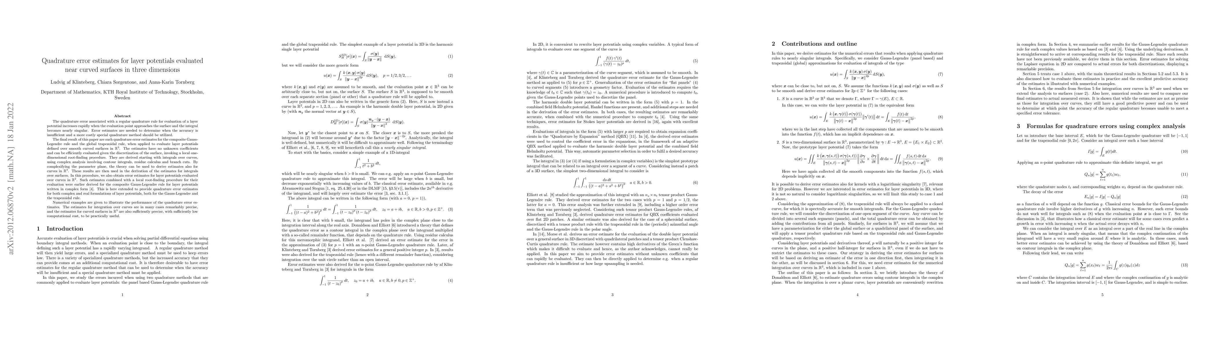 The quadrature error associated with a regular quadrature rule for evaluation of a layer potential increases rapidly when the evaluation point approaches the surface and the integral becomes nearly singular. Error estimates are needed to determine when the accuracy is insufficient and a more costly special quadrature method should be utilized. The final result of this paper are such quadrature error estimates for the composite Gauss-Legendre rule and the global trapezoidal rule, when applied to evaluate layer potentials defined over smooth curved surfaces in R^3. The estimates have no unknown coefficients and can be efficiently evaluated given the discretization of the surface, invoking a local one-dimensional root-finding procedure. They are derived starting with integrals over curves, using complex analysis involving contour integrals, residue calculus and branch cuts. By complexifying the parameter plane, the theory can be used to derive estimates also for curves in in R^3. These results are then used in the derivation of the estimates for integrals over surfaces. In this procedure, we also obtain error estimates for layer potentials evaluated over curves in R^2. Such estimates combined with a local root-finding procedure for their evaluation were earlier derived for the composite Gauss-Legendre rule for layer potentials written on complex form [4]. This is here extended to provide quadrature error estimates for both complex and real formulations of layer potentials, both for the Gauss-Legendre and the trapezoidal rule. Numerical examples are given to illustrate the performance of the quadrature error estimates. The estimates for integration over curves are in many cases remarkably precise, and the estimates for curved surfaces in R^3 are also sufficiently precise, with sufficiently low computational cost, to be practically useful.