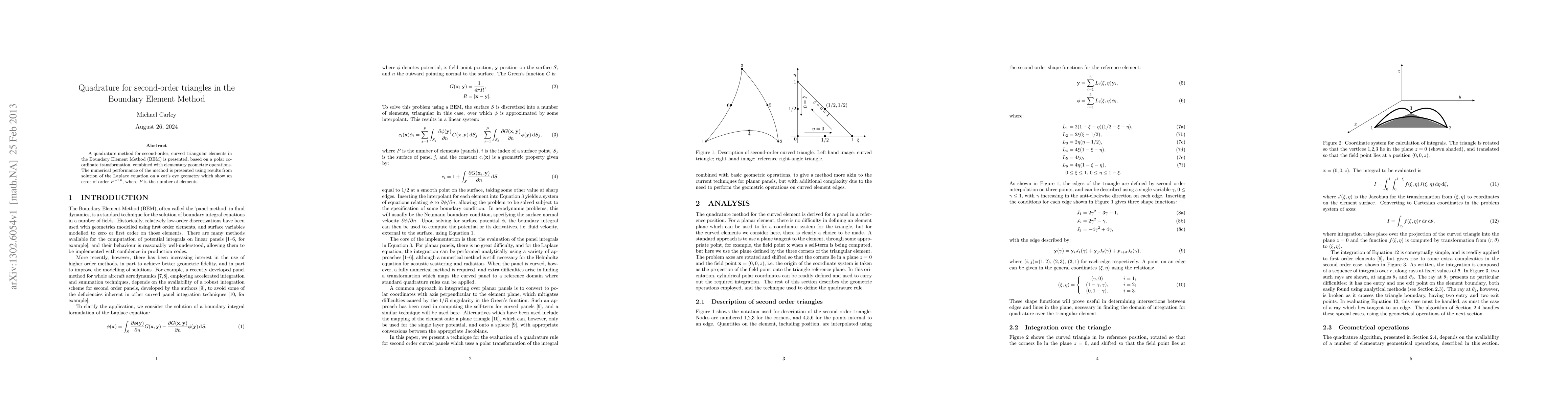 A quadrature method for second-order, curved triangular elements in the Boundary Element Method (BEM) is presented, based on a polar coordinate transformation, combined with elementary geometric operations. The numerical performance of the method is presented using results from solution of the Laplace equation on a cat's eye geometry which show an error of order $P^{-1.6}$, where $P$ is the number of elements.