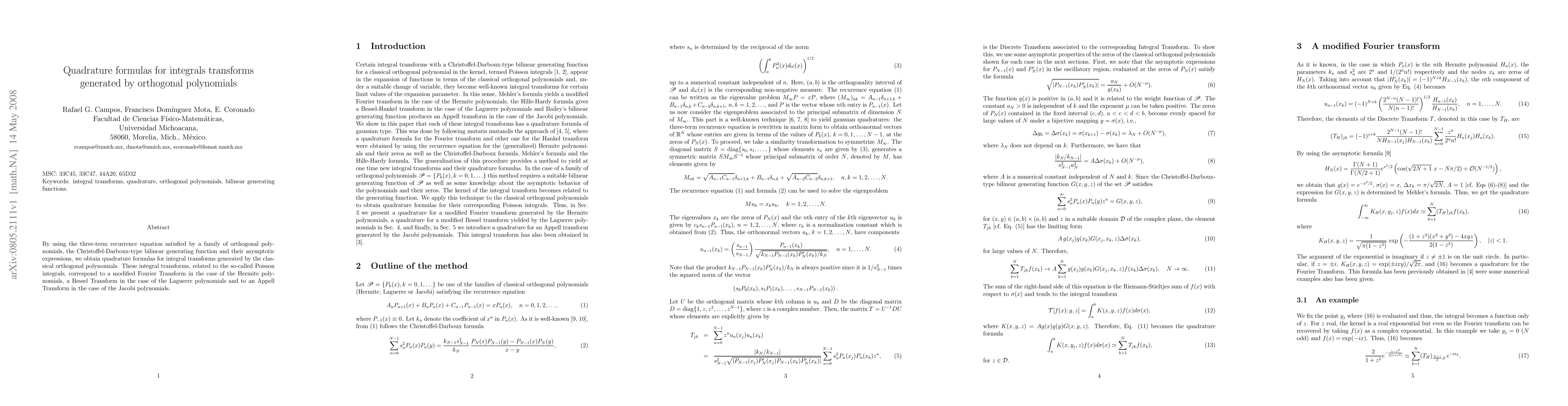 This paper develops quadrature formulas for integral transforms generated by classical orthogonal polynomials, utilizing their recurrence relations and asymptotic expressions. These transforms include modified Fourier, Bessel, and Appell transforms corresponding to Hermite, Laguerre, and Jacobi polynomials respectively.