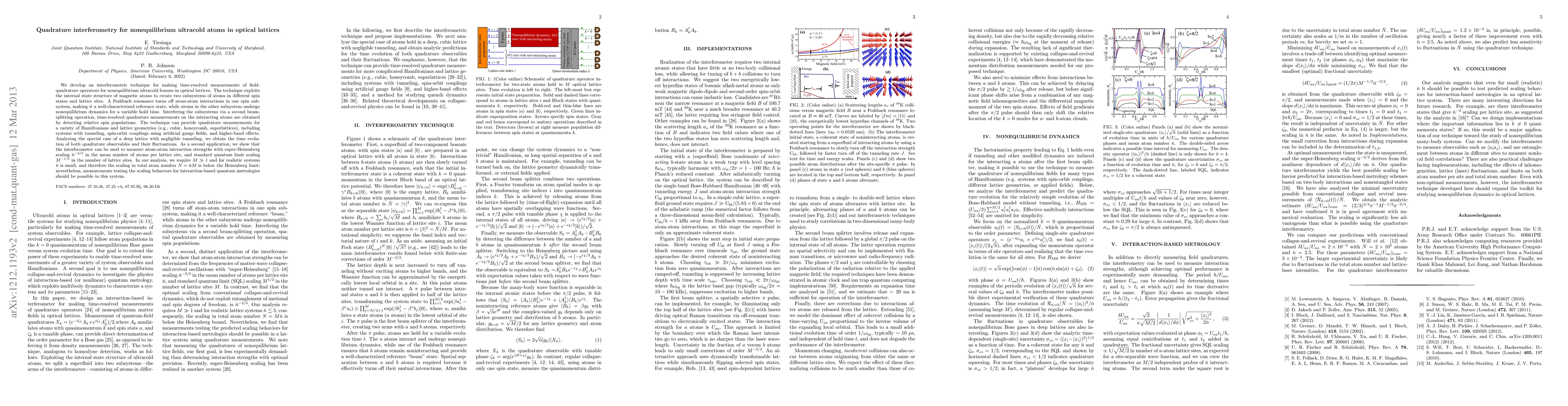 We develop an interferometric technique for making time-resolved measurements of field-quadrature operators for nonequilibrium ultracold bosons in optical lattices. The technique exploits the internal state structure of magnetic atoms to create two subsystems of atoms in different spin states and lattice sites. A Feshbach resonance turns off atom-atom interactions in one spin subsystem, making it a well-characterized reference state, while atoms in the other subsystem undergo nonequilibrium dynamics for a variable hold time. Interfering the subsystems via a second beam-splitting operation, time-resolved quadrature measurements on the interacting atoms are obtained by detecting relative spin populations. The technique can provide quadrature measurements for a variety of Hamiltonians and lattice geometries (e.g., cubic, honeycomb, superlattices), including systems with tunneling, spin-orbit couplings using artificial gauge fields, and higher-band effects. Analyzing the special case of a deep lattice with negligible tunneling, we obtain the time evolution of both quadrature observables and their fluctuations. As a second application, we show that the interferometer can be used to measure atom-atom interaction strengths with super-Heisenberg scaling n^(-3/2) in the mean number of atoms per lattice site n, and standard quantum limit scaling M^(-1/2) in the number of lattice sites M. In our analysis, we require M >> 1 and for realistic systems n is small, and therefore the scaling in total atom number N = nM is below the Heisenberg limit; nevertheless, measurements testing the scaling behaviors for interaction-based quantum metrologies should be possible in this system.