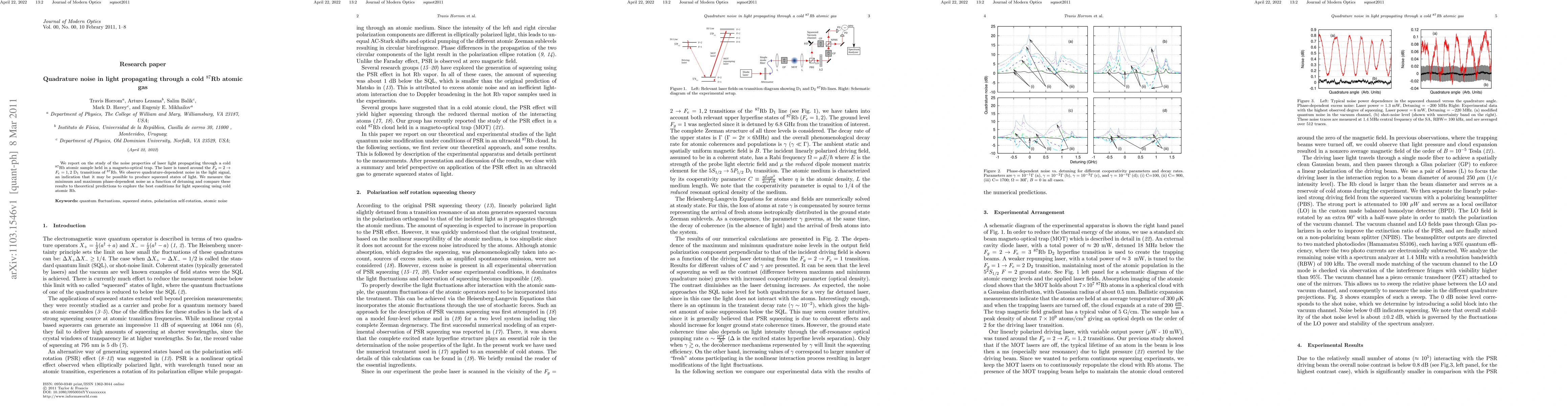 This study investigates the noise properties of laser light passing through a cold 87Rb atomic gas, observing quadrature-dependent noise suggesting potential for light squeezing. The research measures phase-dependent noise variations and compares them to theoretical predictions to identify optimal conditions for light squeezing.