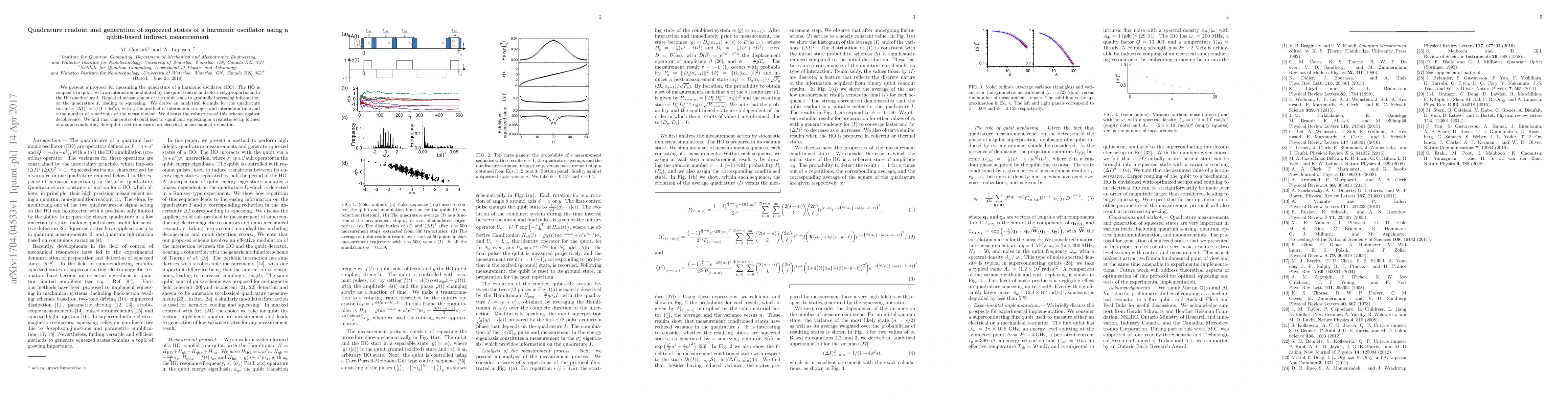 We present a protocol for measuring the quadrature of a harmonic oscillator (HO). The HO is coupled to a qubit, with an interaction modulated by the qubit control and effectively proportional to the HO quadrature $I$. Repeated measurement of the qubit leads to gradually increasing information on the quadrature $I$, leading to squeezing. We derive an analytical formula for the quadrature variance, $(\Delta I)^2 = 1/(1+4\phi^2 s)$, with $\phi$ the product of interaction strength and interaction time and $s$ the number of repetitions of the measurement. We discuss the robustness of this scheme against decoherence. We find that this protocol could lead to significant squeezing in a realistic setup formed of a superconducting flux qubit used to measure an electrical or mechanical resonator.