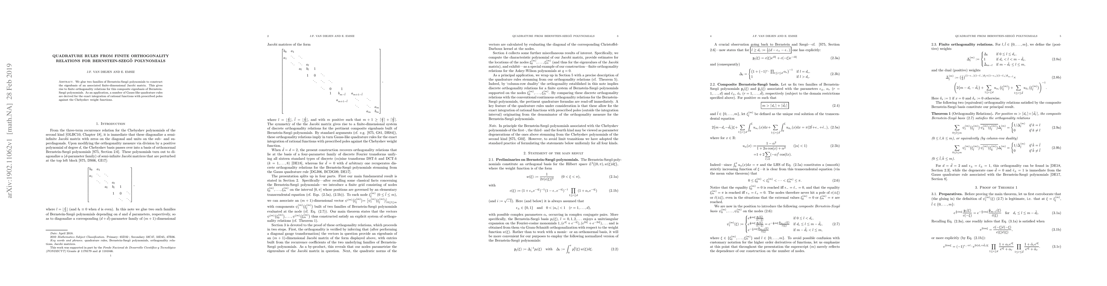 We glue two families of Bernstein-Szego polynomials to construct the eigenbasis of an associated finite-dimensional Jacobi matrix. This gives rise to finite orthogonality relations for this composite eigenbasis of Bernstein-Szego polynomials. As an application, a number of Gauss-like quadrature rules are derived for the exact integration of rational functions with prescribed poles against the Chebyshev weight functions.