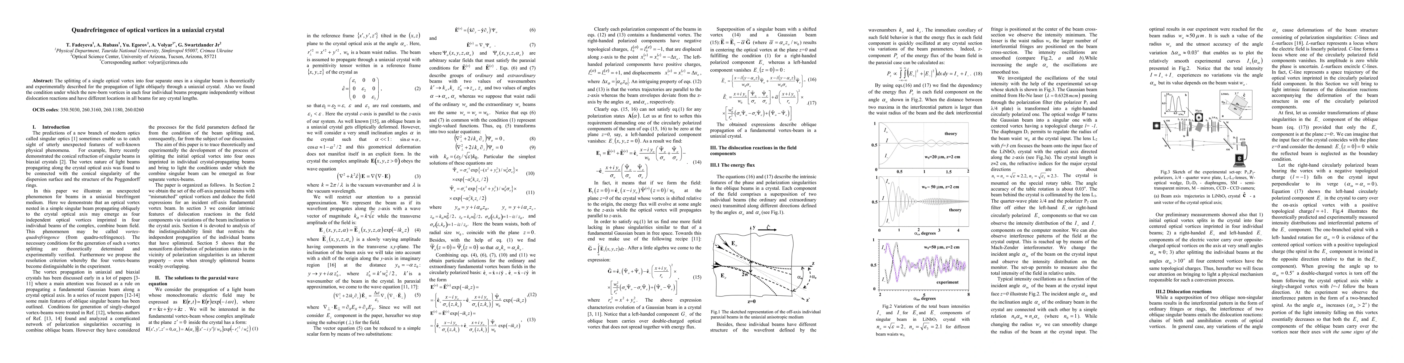 This paper investigates the quadrefringence phenomenon where a single optical vortex splits into four distinct vortices when light propagates obliquely through a uniaxial crystal. The study provides both theoretical and experimental evidence for the independent propagation of these new vortices without interference, regardless of the crystal length.