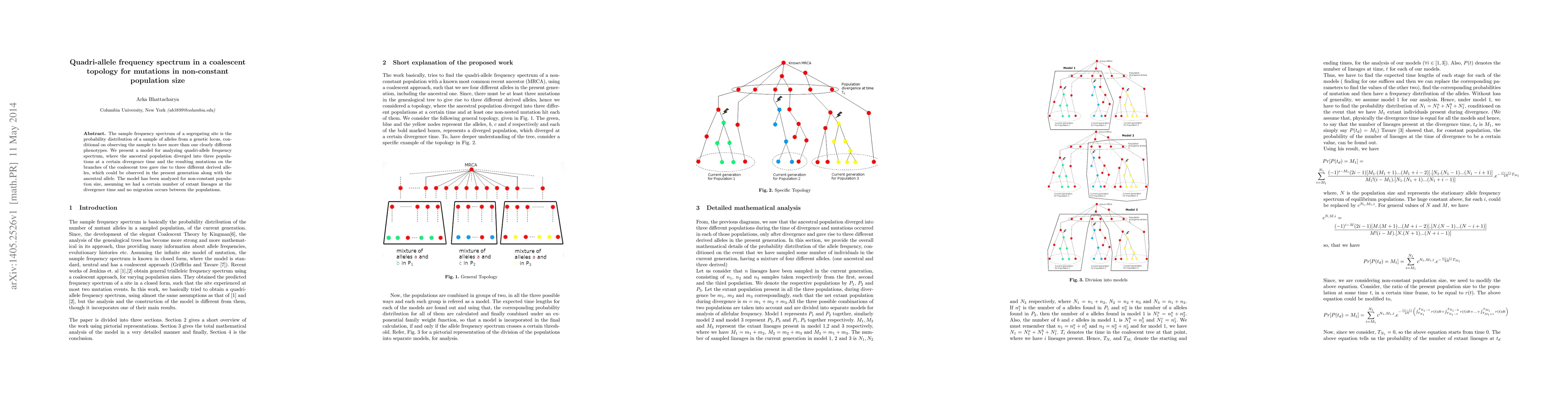 This paper presents a model for analyzing the quadri-allele frequency spectrum in a coalescent topology, considering a scenario where an ancestral population diverged into three populations, leading to three derived alleles alongside the ancestral allele. The analysis accounts for non-constant population size without migration between populations.
