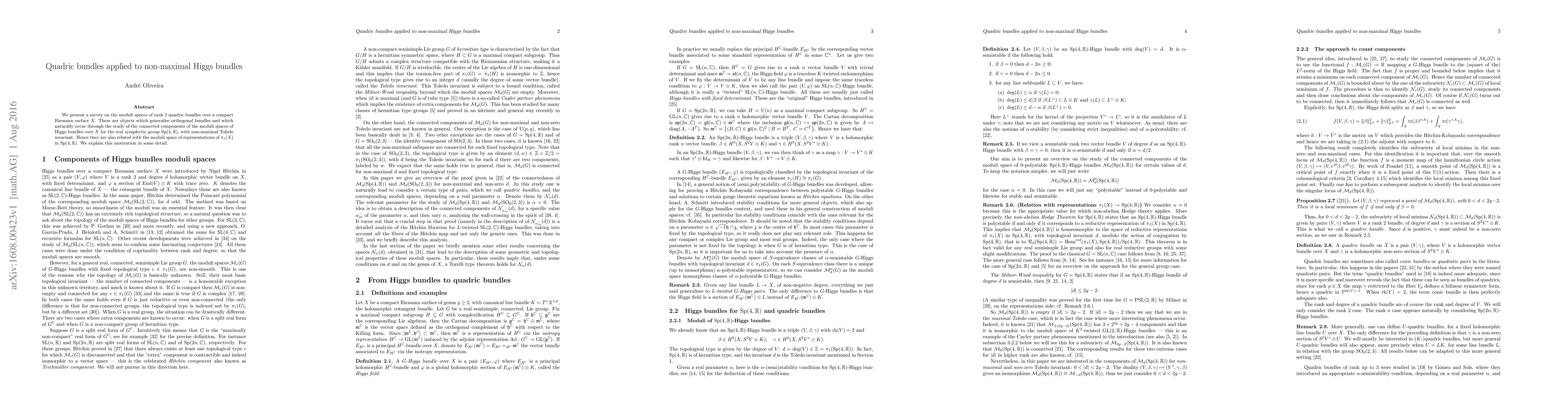 This paper surveys moduli spaces of rank 2 quadric bundles over a compact Riemann surface, generalizing orthogonal bundles and linked to the study of Higgs bundles for the real symplectic group Sp(4,R) with non-maximal Toledo invariant. It explores their connection to the representation space of the fundamental group in Sp(4,R).