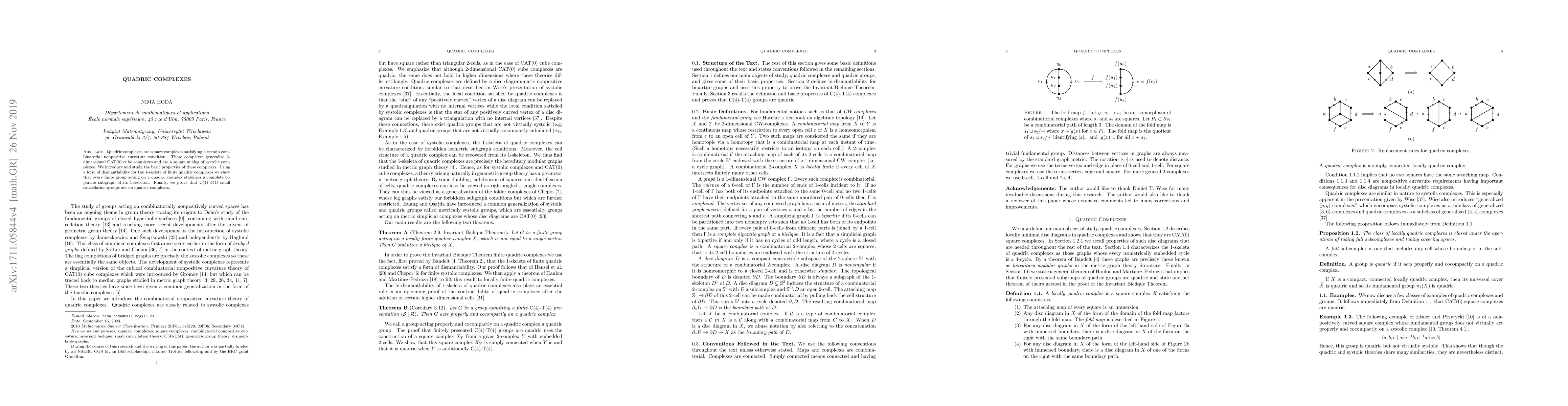 Quadric complexes are square complexes satisfying a certain combinatorial nonpositive curvature condition. These complexes generalize 2-dimensional CAT(0) cube complexes and are a square analog of systolic complexes. We introduce and study the basic properties of these complexes. Using a form of dismantlability for the 1-skeleta of finite quadric complexes we show that every finite group acting on a quadric complex stabilizes a complete bipartite subgraph of its 1-skeleton. Finally, we prove that C(4)-T(4) small cancellation groups act on quadric complexes.