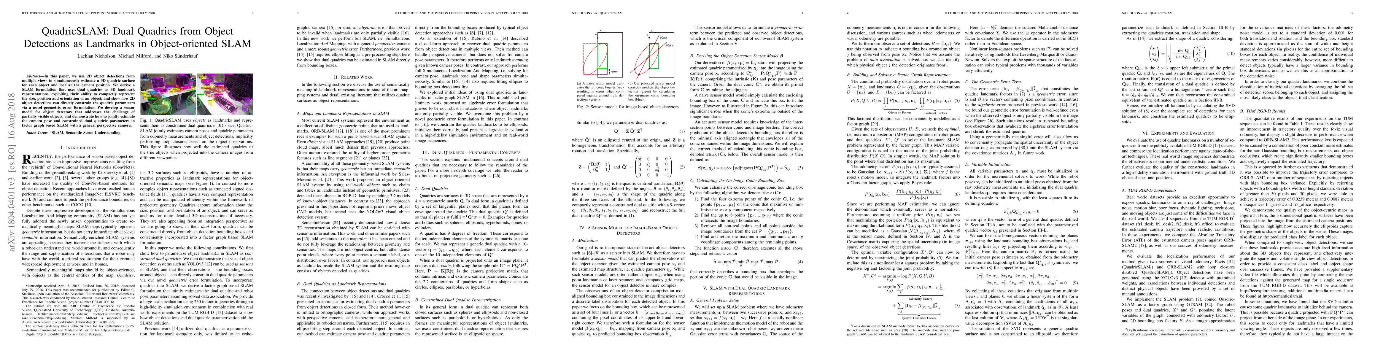 QuadricSLAM leverages 2D object detections to estimate 3D quadric surfaces for objects, using these as landmarks in object-oriented SLAM. The method formulates a SLAM framework that directly constrains quadric parameters through a novel geometric error model, enabling simultaneous camera localization and object representation.