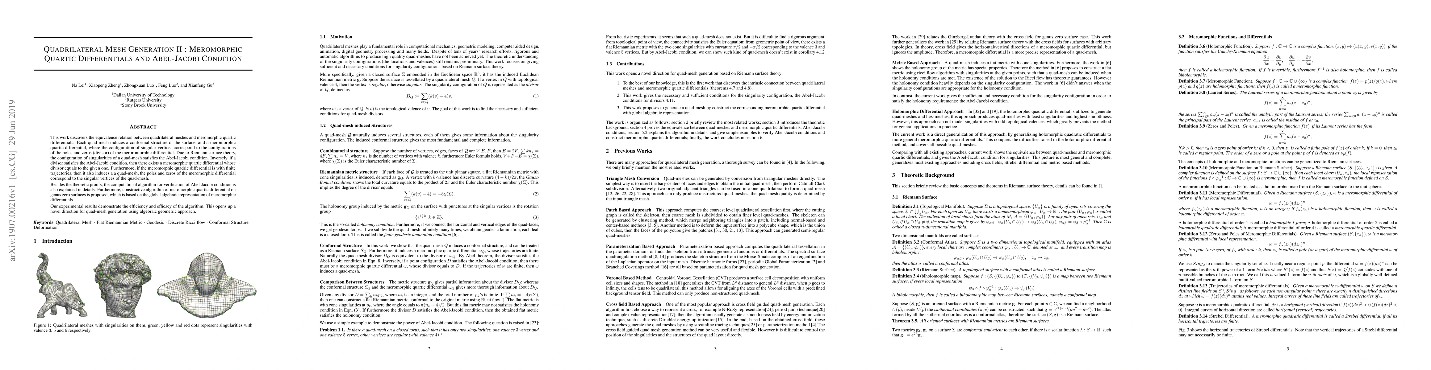 This work discovers the equivalence relation between quadrilateral meshes and meromorphic quartic. Each quad-mesh induces a conformal structure of the surface, and a meromorphic differential, where the configuration of singular vertices correspond to the configurations the poles and zeros (divisor) of the meroromorphic differential. Due to Riemann surface theory, the configuration of singularities of a quad-mesh satisfies the Abel-Jacobi condition. Inversely, if a satisfies the Abel-Jacobi condition, then there exists a meromorphic quartic differential whose equals to the given one. Furthermore, if the meromorphic quadric differential is with finite, then it also induces a a quad-mesh, the poles and zeros of the meromorphic differential to the singular vertices of the quad-mesh. Besides the theoretic proofs, the computational algorithm for verification of Abel-Jacobi condition is explained in details. Furthermore, constructive algorithm of meromorphic quartic differential on zero surfaces is proposed, which is based on the global algebraic representation of meromorphic. Our experimental results demonstrate the efficiency and efficacy of the algorithm. This opens up a direction for quad-mesh generation using algebraic geometric approach.