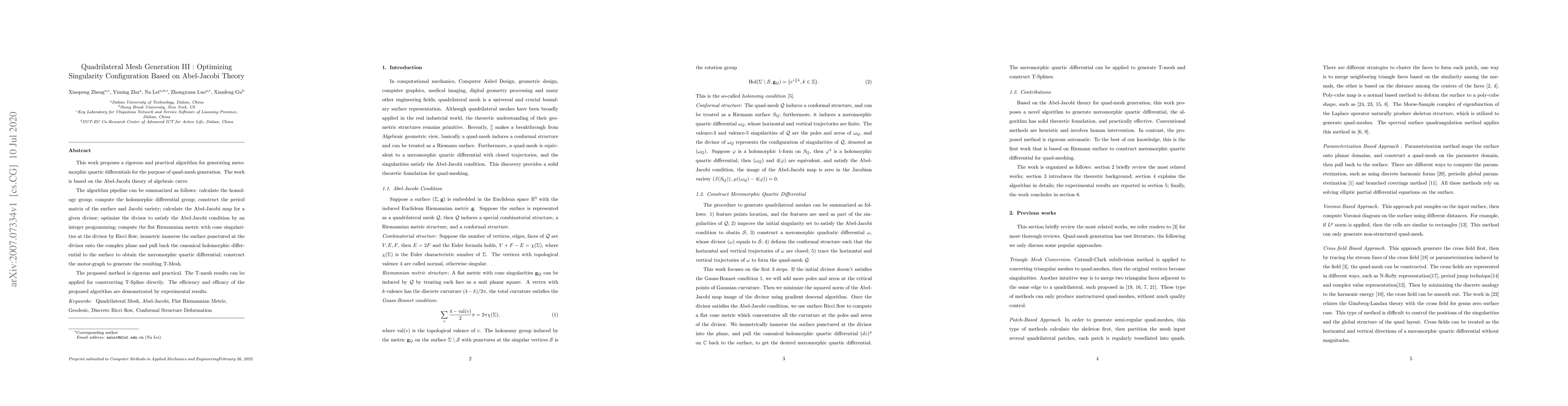 The novelty of this work lies in its application of Abel-Jacobi theory to optimize singularity configurations for quad-mesh generation, combined with the use of Ricci flow for metric customization, offering a robust and practical solution for complex surface meshing.