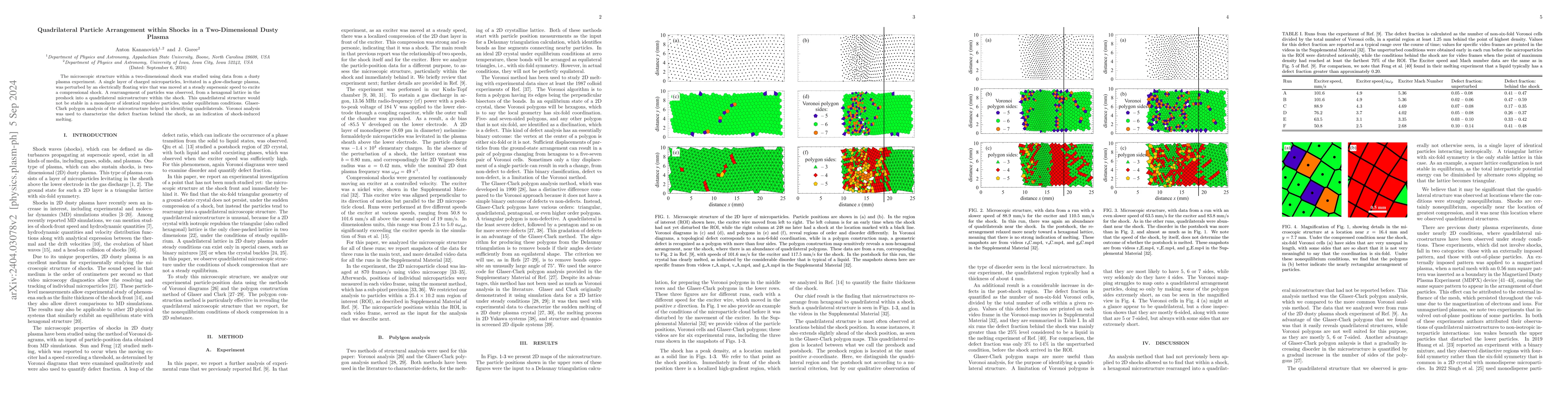 In a two-dimensional dusty plasma, a shock wave created by a supersonic wire induces a particle rearrangement from hexagonal to quadrilateral microstructures, analyzed via Glaser-Clark polygon and Voronoi methods to assess shock-induced defects.