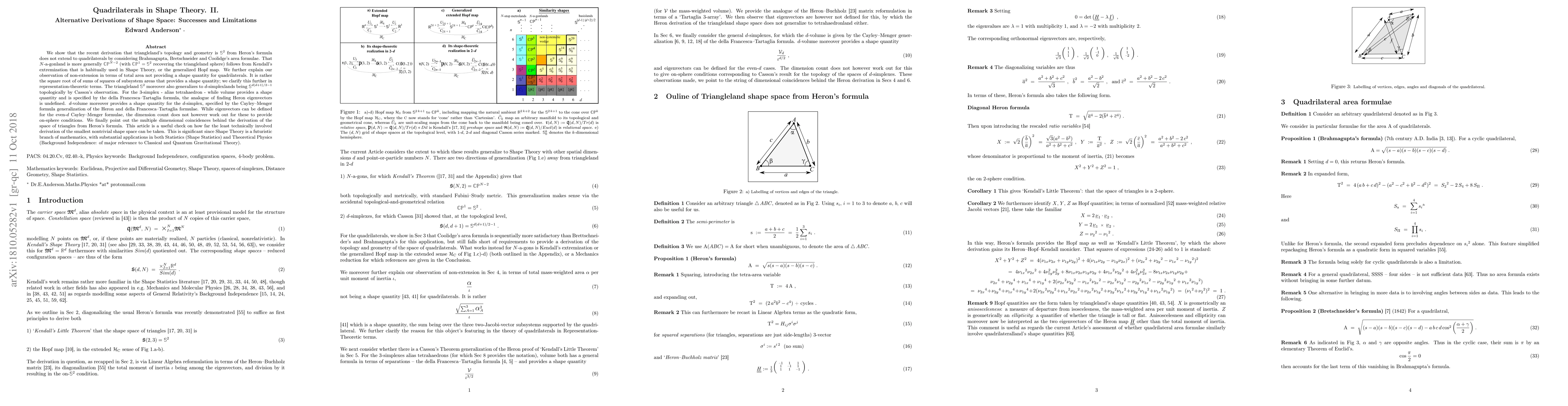 We show that the recent derivation that triangleland's topology and geometry is $S^2$ from Heron's formula does not extend to quadrilaterals by considering Brahmagupta, Bretschneider and Coolidge's area formulae. That $N$-a-gonland is more generally $CP^{N - 2}$ (with $CP^1 = S^2$ recovering the triangleland sphere) follows from Kendall's extremization that is habitually used in Shape Theory, or the generalized Hopf map. We further explain our observation of non-extension in terms of total area not providing a shape quantity for quadrilaterals. It is rather the square root of of sums of squares of subsystem areas that provides a shape quantity; we clarify this further in representation-theoretic terms. The triangleland $S^2$ moreover also generalizes to $d$-simplexlands being $S^{d(d + 1)/2 - 1}$ topologically by Casson's observation. For the 3-simplex - alias tetrahaedron - while volume provides a shape quantity and is specified by the della Francesca-Tartaglia formula, the analogue of finding Heron eigenvectors is undefined. $d$-volume moreover provides a shape quantity for the $d$-simplex, specified by the Cayley-Menger formula generalization of the Heron and della Francesca-Tartaglia formulae. While eigenvectors can be defined for the even-$d$ Cayley-Menger formulae, the dimension count does not however work out for these to provide on-sphere conditions. We finally point out the multiple dimensional coincidences behind the derivation of the space of triangles from Heron's formula. This article is a useful check on how far the least technically involved derivation of the smallest nontrivial shape space can be taken. This is significant since Shape Theory is a futuristic branch of mathematics, with substantial applications in both Statistics (Shape Statistics) and Theoretical Physics (Background Independence: of major relevance to Classical and Quantum Gravitational Theory).