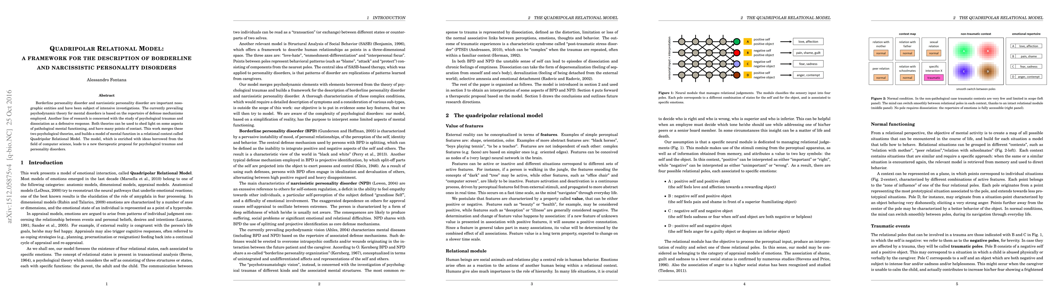 The Quadripolar Relational Model integrates psychodynamic theory and psychological trauma research to describe borderline and narcissistic personality disorders, offering a new therapeutic approach. It combines defense mechanisms and dissociation concepts with computer science ideas for a comprehensive relational framework.