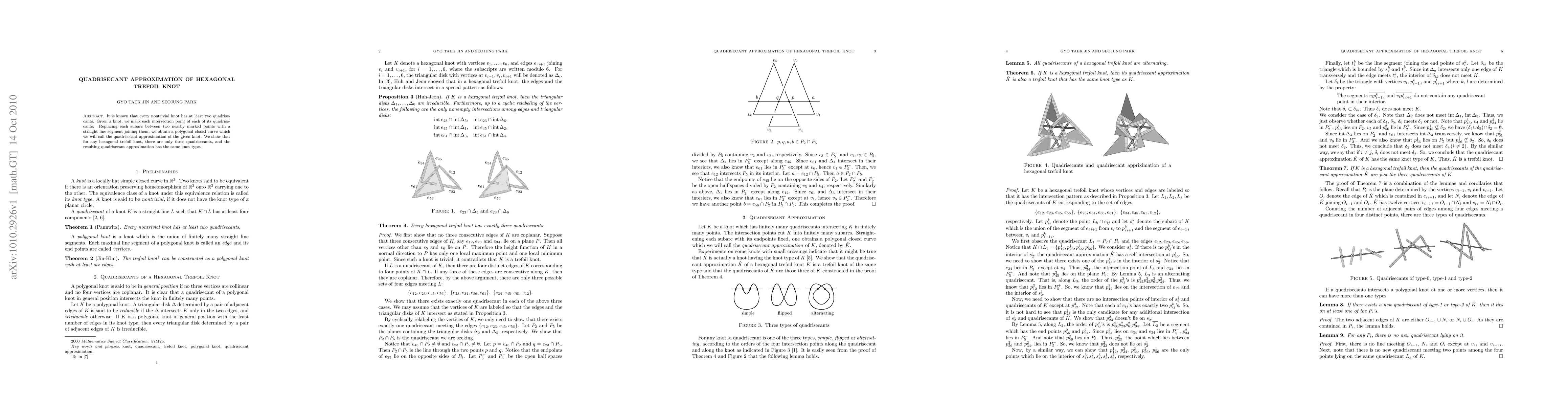 This paper investigates the quadrisecant approximation of a hexagonal trefoil knot, demonstrating that it retains the same knot type despite the replacement of subarcs with straight line segments between marked intersection points of its three quadrisecants. The method provides a polygonal representation of the original knot.