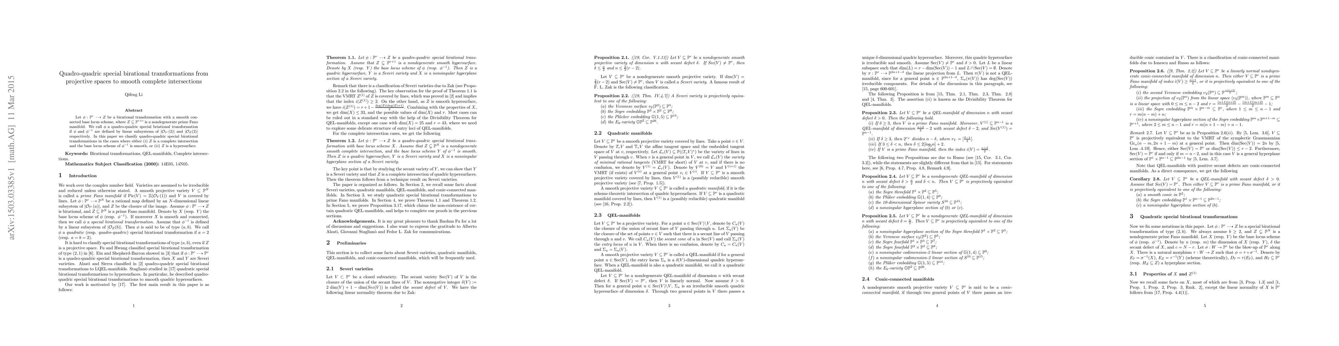 Let \phi: \mathbb{P}^{r}\dashrightarrow Z be a birational transformation with a smooth connected base locus scheme, where Z\subseteq\mathbb{P}^{r+c} is a nondegenerate prime Fano manifold. We call \phi a quadro-quadric special briational transformation if \phi and \phi^{-1} are defined by linear subsystems of |\mathcal{O}_{\mathbb{P}^{r}}(2)| and |\mathcal{O}_{Z}(2)| respectively. In this paper we classify quadro-quadric special birational transformations in the cases where either (i) Z is a complete intersection and the base locus scheme of \phi^{-1} is smooth, or (ii) Z is a hypersurface.