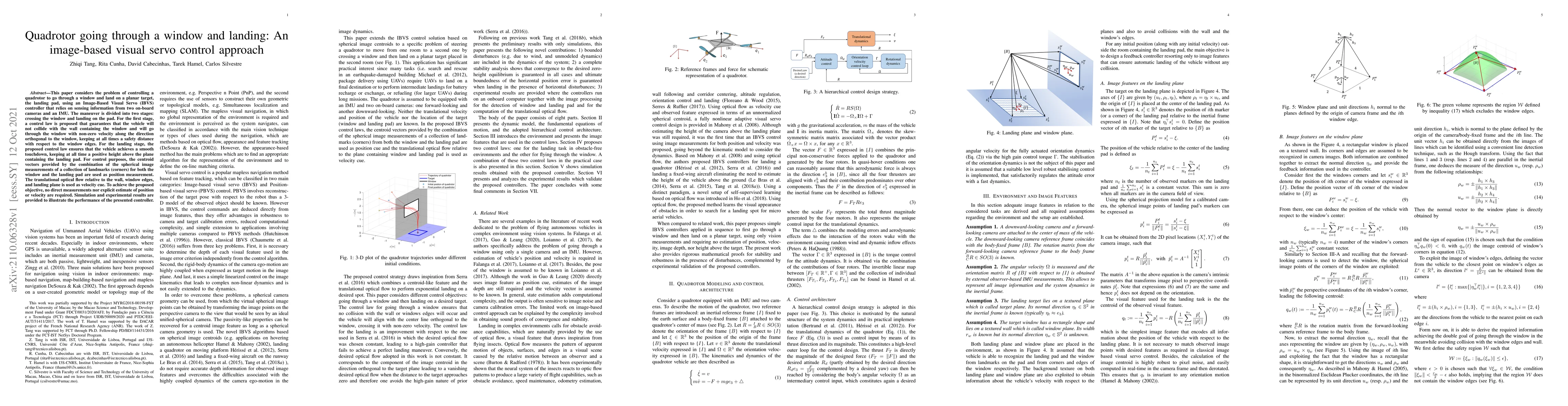 Researchers developed an image-based visual servo control approach for a quadrotor to pass through a window and land on a target, using camera and IMU data without direct measurements or explicit estimates of position or velocity.