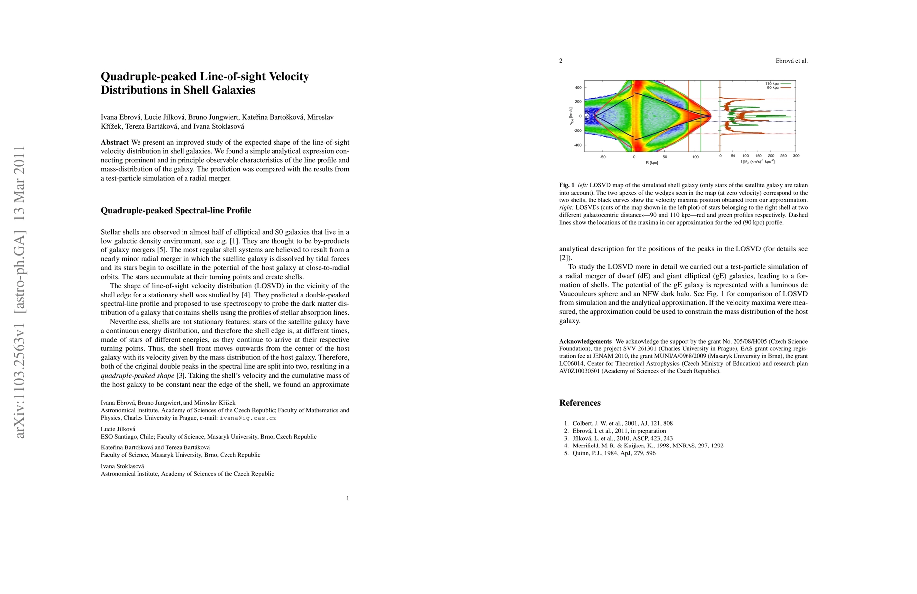 Summary: This study derives an analytical expression for the quadruple-peaked line-of-sight velocity distribution in shell galaxies, linking observable line profile characteristics to the galaxy's mass distribution. The findings were validated through a test-particle simulation of a radial merger.