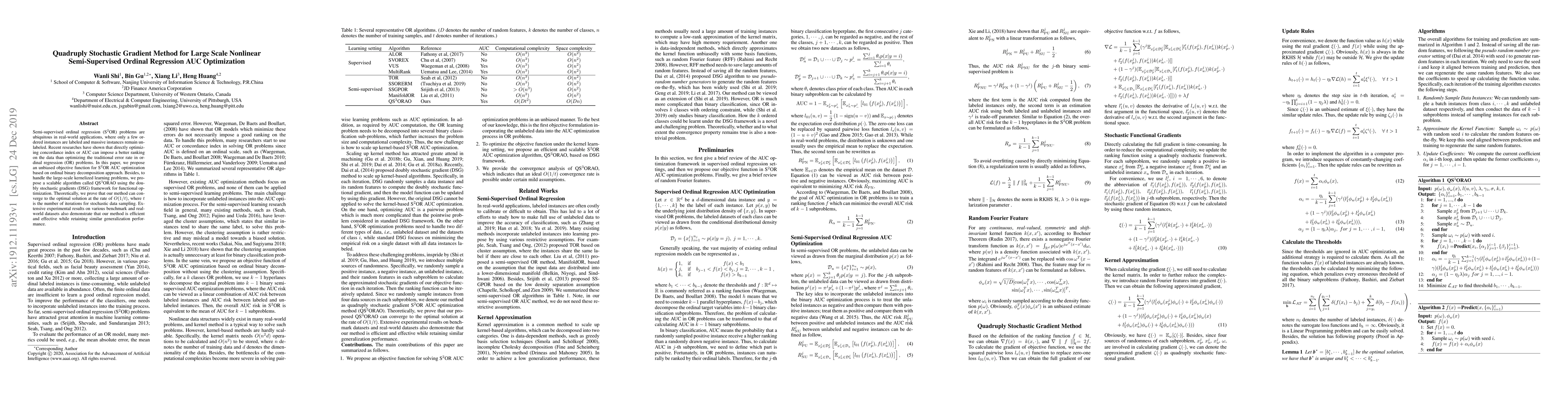This paper proposes a quadruply stochastic gradient method, QS^3ORAO, to optimize the AUC for large-scale semi-supervised ordinal regression. The method uses an unbiased objective function based on ordinal binary decomposition and doubly stochastic gradients for scalability, achieving convergence at a rate of $O(1/t)$. Experimental results demonstrate its efficiency and effectiveness.