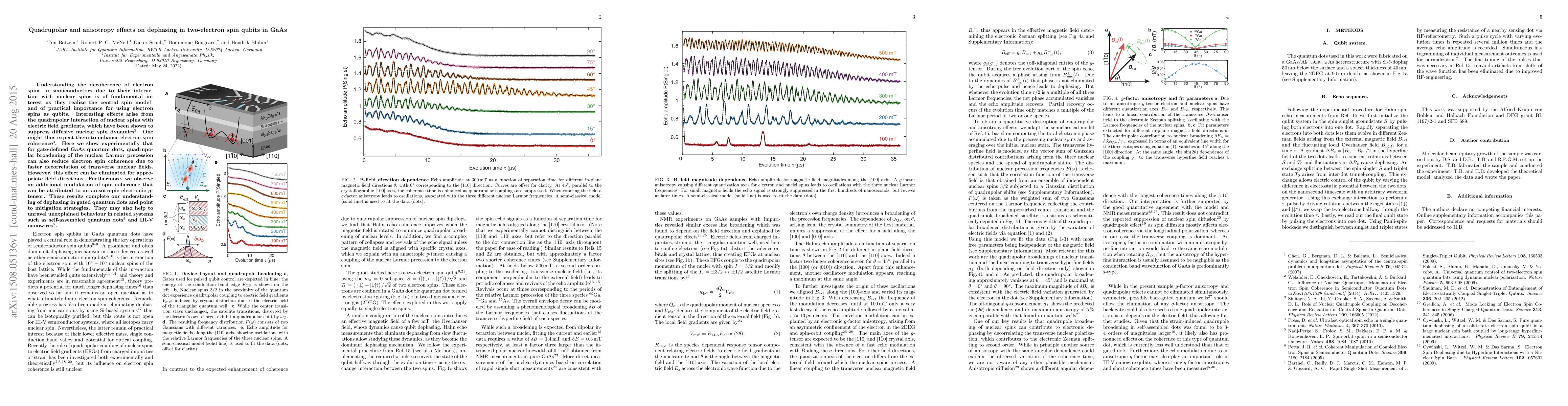 This paper investigates how quadrupolar and anisotropy effects influence dephasing in two-electron spin qubits in GaAs quantum dots. It finds that quadrupolar interactions can reduce electron spin coherence but this effect can be mitigated by specific field orientations, while anisotropy from the electronic $g$-tensor also modulates coherence.