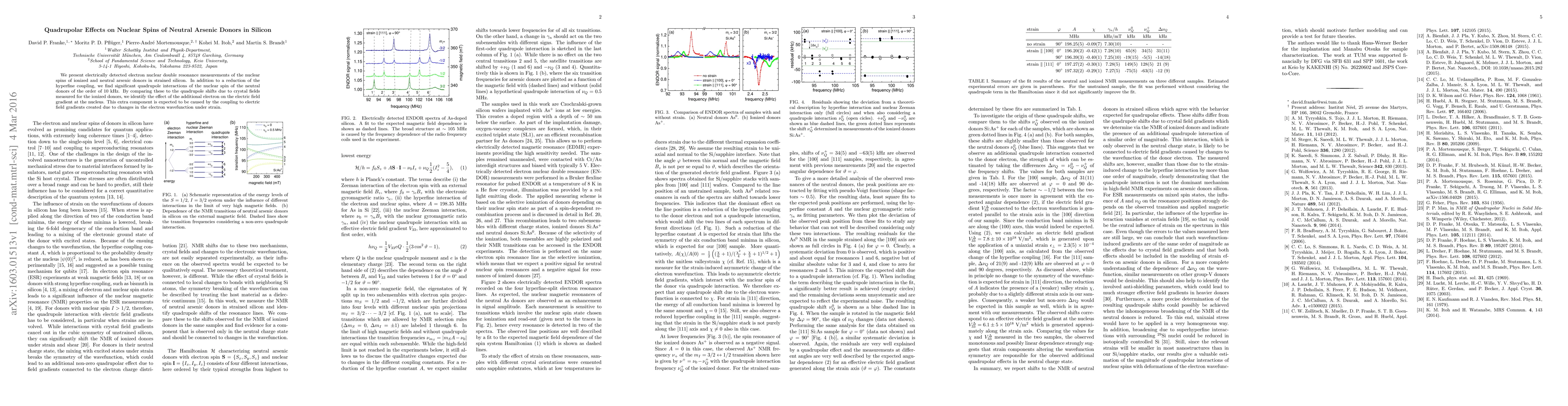 This study uses electrically detected electron nuclear double resonance to investigate the nuclear spins of arsenic donors in silicon, revealing significant quadrupolar interactions for neutral donors of about 10 kHz. The comparison with ionized donors' quadrupole shifts identifies the additional electron's effect on the electric field gradient, likely due to changes in the electron wavefunction under strain.