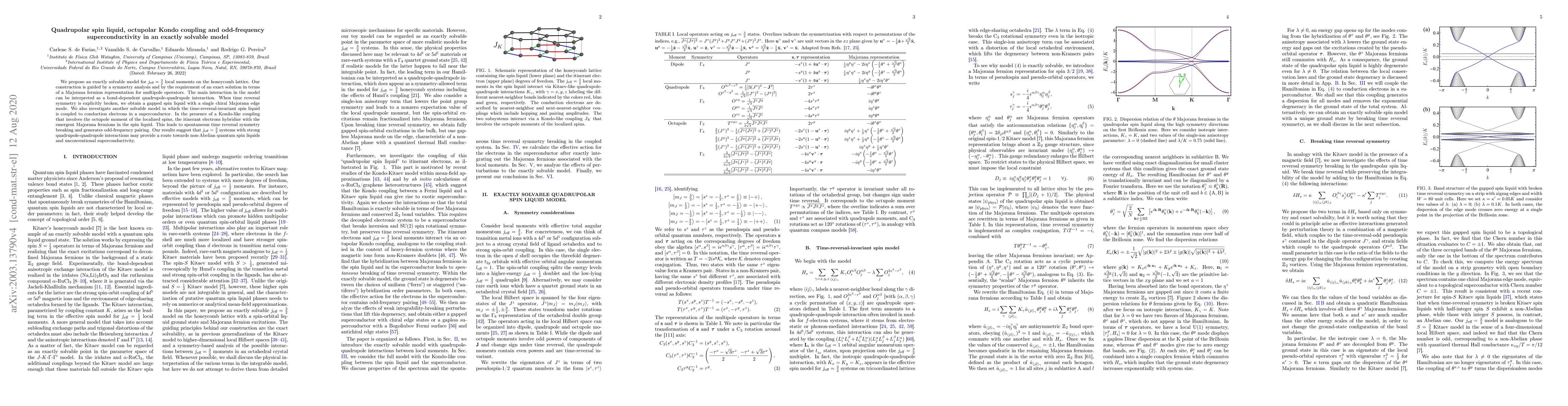 We propose an exactly solvable model for $j_{\text{eff}}=\frac32$ local moments on the honeycomb lattice. Our construction is guided by a symmetry analysis and by the requirement of an exact solution in terms of a Majorana fermion representation for multipole operators. The main interaction in the model can be interpreted as a bond-dependent quadrupole-quadrupole interaction. When time reversal symmetry is explicitly broken, we obtain a gapped spin liquid with a single chiral Majorana edge mode. We also investigate another solvable model in which the time-reversal-invariant spin liquid is coupled to conduction electrons in a superconductor. In the presence of a Kondo-like coupling that involves the octupole moment of the localized spins, the itinerant electrons hybridize with the emergent Majorana fermions in the spin liquid. This leads to spontaneous time reversal symmetry breaking and generates odd-frequency pairing. Our results suggest that $j_{\text{eff}}=\frac32$ systems with strong quadrupole-quadrupole interactions may provide a route towards non-Abelian quantum spin liquids and unconventional superconductivity.