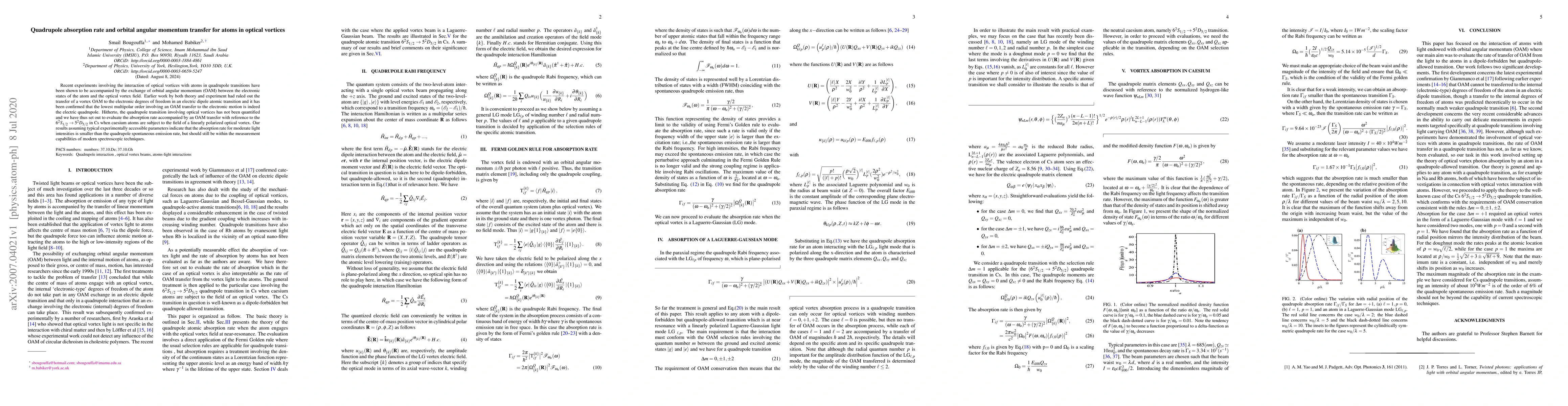 This paper quantifies the absorption rate and orbital angular momentum transfer during quadrupole transitions in atoms interacting with optical vortices, specifically for the $6^2S_{1/2}\rightarrow 5^2D_{5/2}$ transition in Cs. The study finds that while the absorption rate is smaller than the quadrupole spontaneous emission rate, it remains measurable with current spectroscopic techniques.