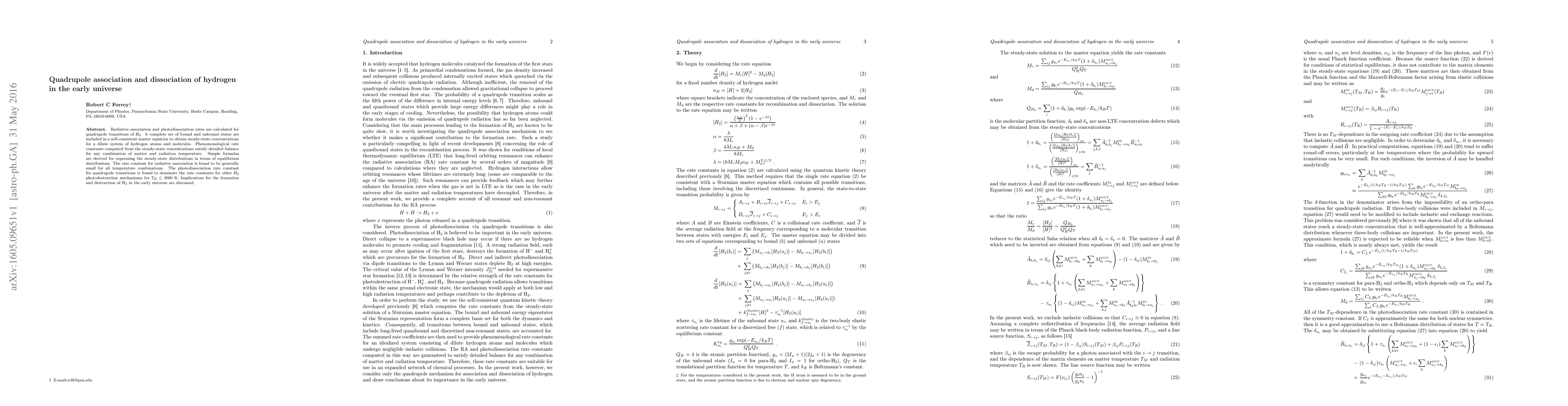 This paper calculates radiative association and photodissociation rates for quadrupole transitions of H2, determining steady-state concentrations for hydrogen atoms and molecules. It finds that the photodissociation rate for quadrupole transitions dominates H2 destruction at low radiation temperatures, with implications for H2 formation and destruction in the early universe.