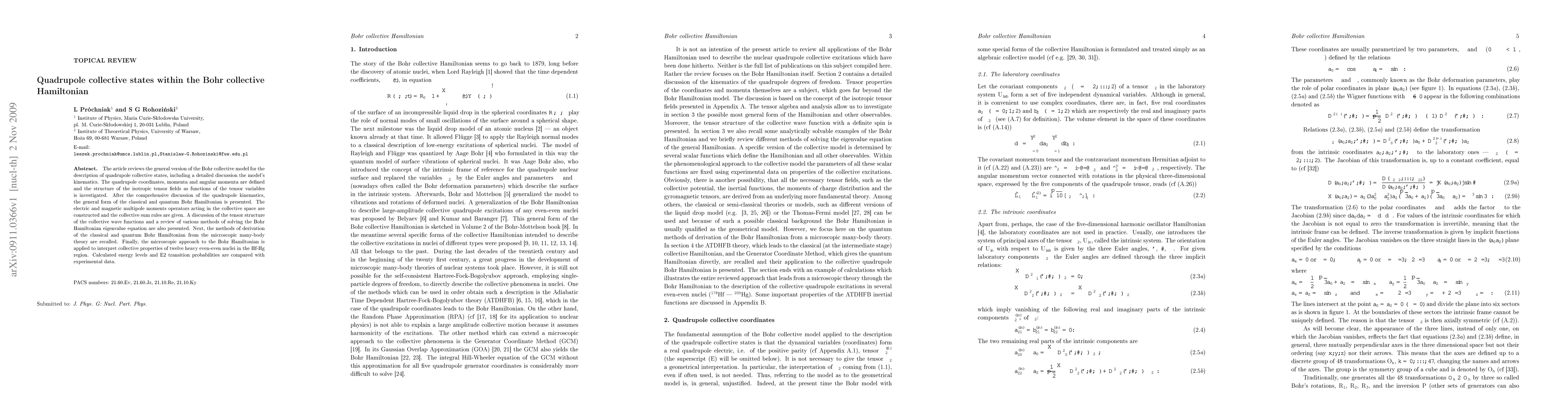 This paper reviews the Bohr collective model for describing quadrupole collective states, presenting the classical and quantum Hamiltonian forms and discussing methods for solving the associated eigenvalue equations. It applies a microscopic approach to interpret collective properties of heavy even-even nuclei in the Hf-Hg region.
