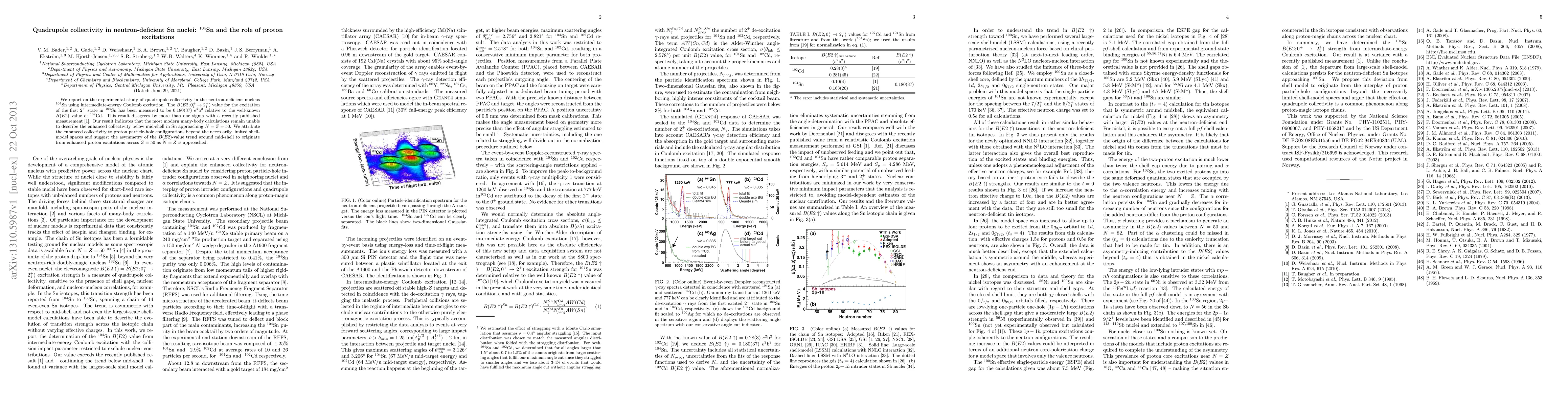 We report on the experimental study of quadrupole collectivity in the neutron-deficient nucleus \nuc{104}{Sn} using intermediate-energy Coulomb excitation. The $B(E2; 0^+_1 \rightarrow 2^+_1)$ value for the excitation of the first $2^+$ state in \nuc{104}{Sn} has been measured to be $0.180(37)~e^2$b$^2$ relative to the well-known $B(E2)$ value of \nuc{102}{Cd}. This result disagrees by more than one sigma with a recently published measurement \cite{Gua13}. Our result indicates that the most modern many-body calculations remain unable to describe the enhanced collectivity below mid-shell in Sn approaching $N=Z=50$. We attribute the enhanced collectivity to proton particle-hole configurations beyond the necessarily limited shell-model spaces and suggest the asymmetry of the $B(E2)$-value trend around mid-shell to originate from enhanced proton excitations across $Z=50$ as $N=Z$ is approached.