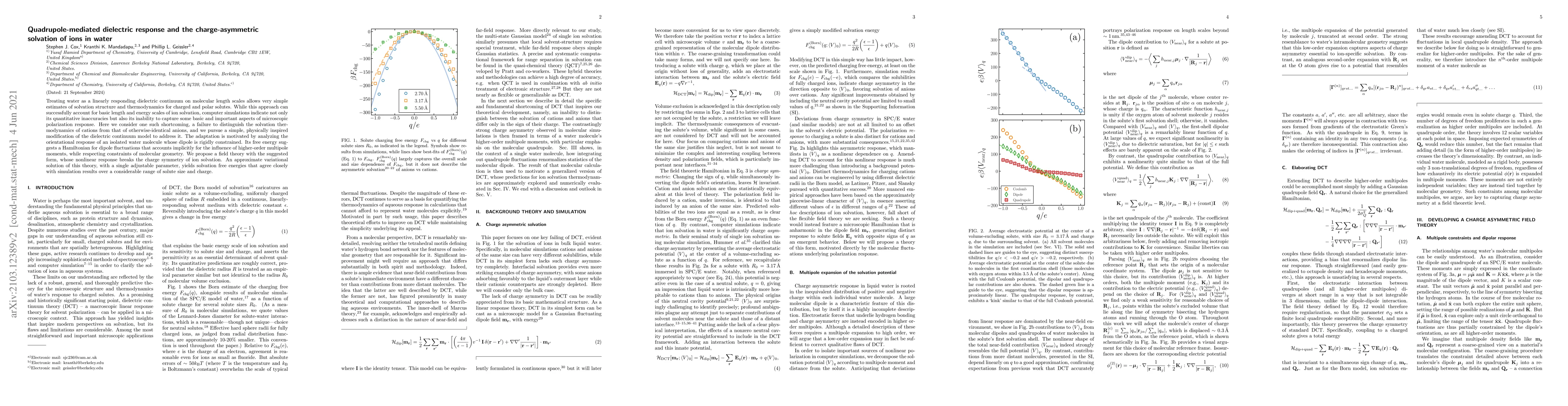 This paper proposes a modified dielectric continuum model to better capture the asymmetric solvation of cations and anions in water, addressing the limitations of traditional linear models. The new model incorporates higher-order multipole moments through a Hamiltonian for dipole fluctuations, leading to a nonlinear response that distinguishes the solvation thermodynamics of ions based on their charge.
