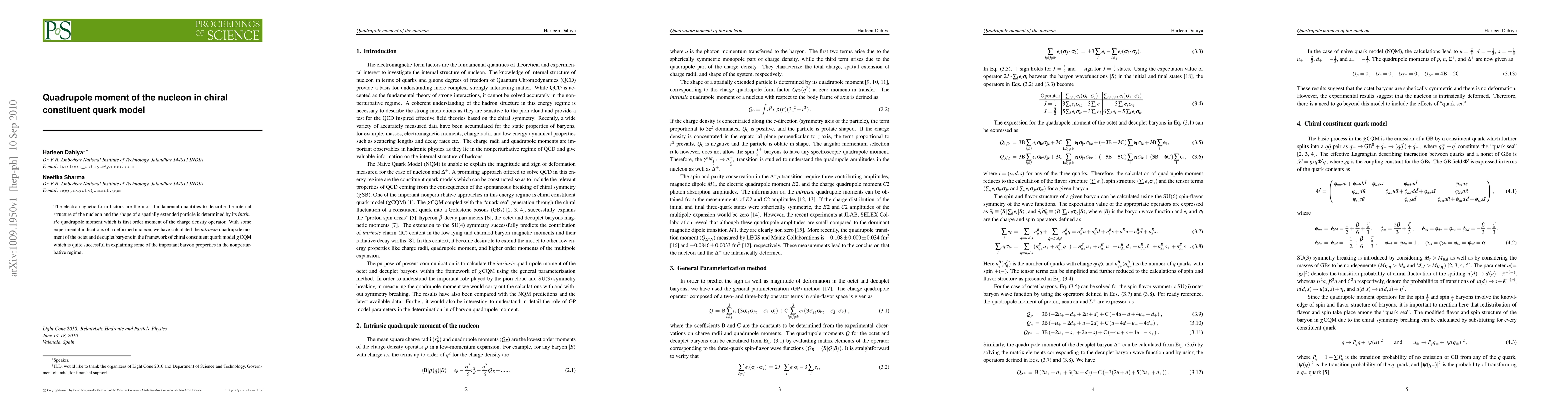 The electromagnetic form factors are the most fundamental quantities to describe the internal structure of the nucleon and the shape of a spatially extended particle is determined by its {\it intrinsic} quadrupole moment which is first order moment of the charge density operator. With some experimental indications of a deformed nucleon, we have calculated the {\it intrinsic} quadrupole moment of the octet and decuplet baryons in the framework of chiral constituent quark model \chiCQM which is quite successful in explaining some of the important baryon properties in the nonperturbative regime.