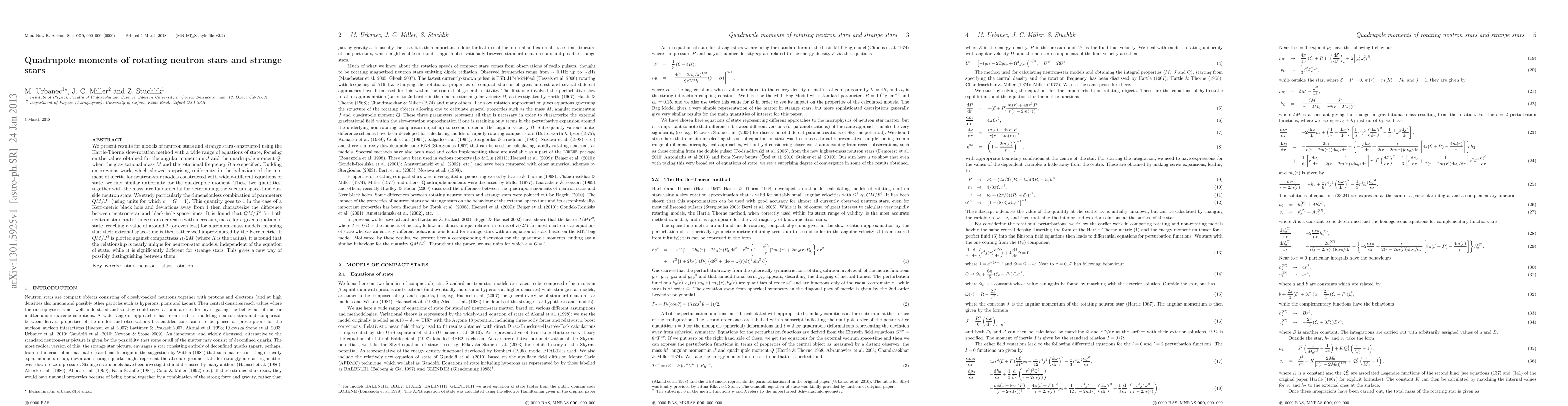 We present results for models of neutron stars and strange stars constructed using the Hartle-Thorne slow-rotation method with a wide range of equations of state, focusing on the values obtained for the angular momentum $J$ and the quadrupole moment $Q$, when the gravitational mass $M$ and the rotational frequency $\Omega$ are specified. Building on previous work, which showed surprising uniformity in the behaviour of the moment of inertia for neutron-star models constructed with widely-different equations of state, we find similar uniformity for the quadrupole moment. These two quantities, together with the mass, are fundamental for determining the vacuum space-time outside neutron stars. We study particularly the dimensionless combination of parameters $QM/J^2$ (using units for which $c=G=1$). This quantity goes to 1 in the case of a Kerr-metric black hole and deviations away from 1 then characterize the difference between neutron-star and black-hole space-times. It is found that $QM/J^2$ for both neutron stars and strange stars decreases with increasing mass, for a given equation of state, reaching a value of around 2 (or even less) for maximum-mass models, meaning that their external space-time is then rather well approximated by the Kerr metric. If $QM/J^2$ is plotter against compactness $R/2M$ (where $R$ is the radius), it is found that the relationship is nearly unique for neutron-star models, independent of the equation of state, while it is significantly different for strange stars. This gives a new way of possibly distinguishing between them.