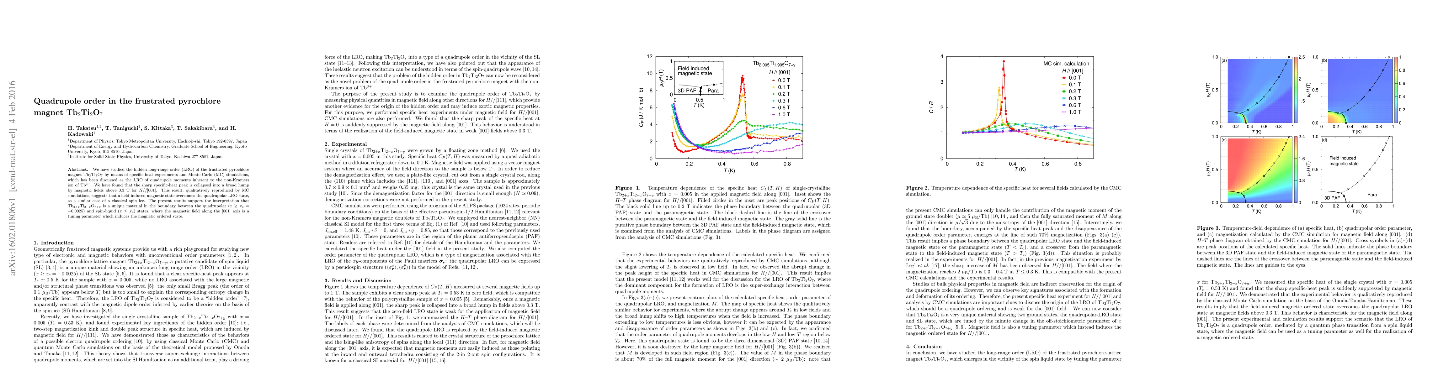 This study reveals the complex order in the frustrated pyrochlore magnet Tb$_2$Ti$_2$O$_7$, showing that magnetic fields above 0.3 T collapse its quadrupole long-range order, suggesting a transition to a magnetic state akin to spin ice. The findings position Tb$_{2+x}$Ti$_{2-x}$O$_{7+y}$ as a unique boundary material between quadrupolar and spin-liquid states, with magnetic fields along the [001] axis acting as a critical tuning parameter.