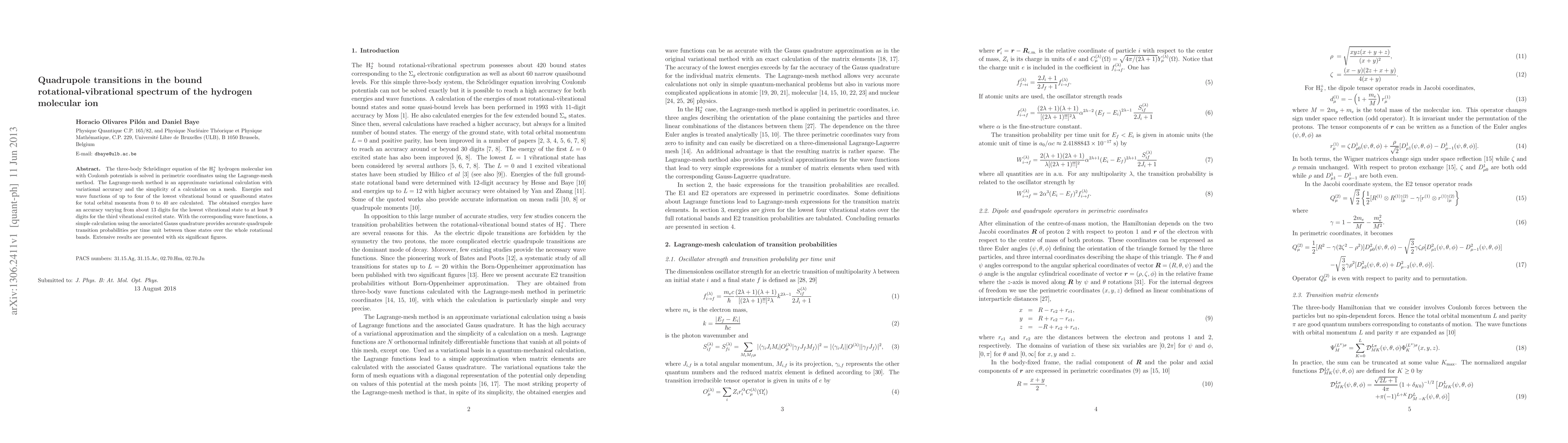 This paper solves the three-body Schrödinger equation for the H$_2^+$ ion using the Lagrange-mesh method, yielding highly accurate energies and wave functions for the lowest vibrational states. The study also calculates precise quadrupole transition probabilities between these states, providing extensive results with six significant figures.
