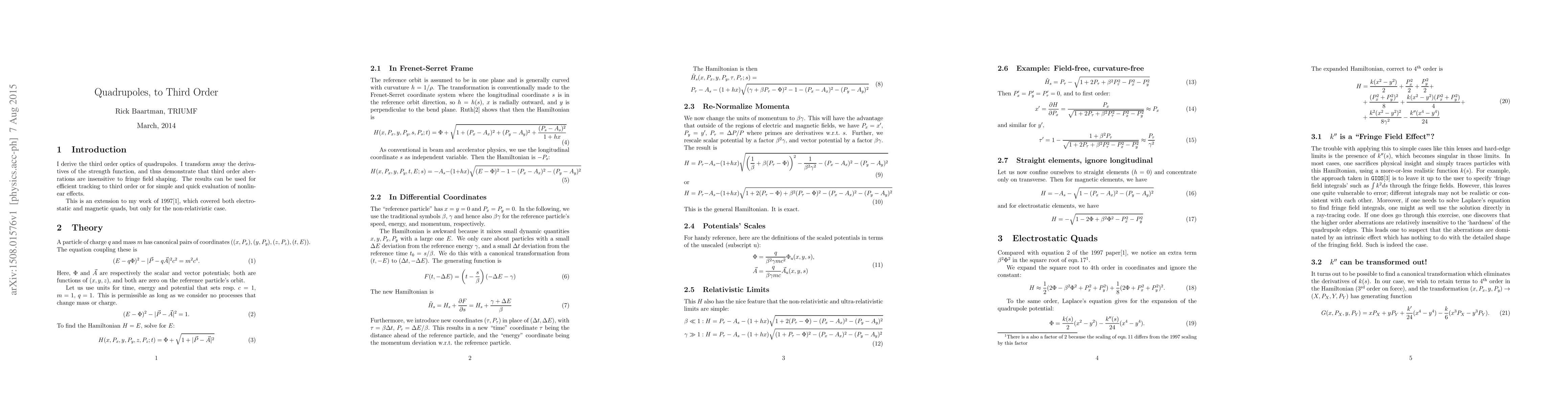 I derive the third order optics of quadrupoles. I transform away the derivatives of the strength function, and thus demonstrate that third order aberrations are insensitive to fringe field shaping. The results can be used for efficient tracking to third order or for simple and quick evaluation of nonlinear effects.