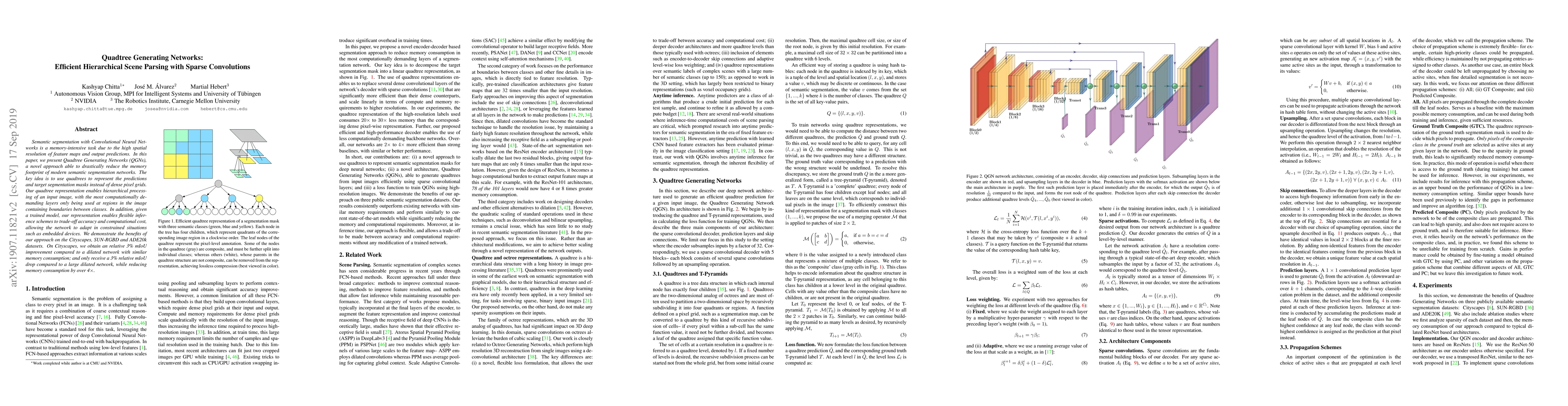 The paper introduces Quadtree Generating Networks (QGNs) to reduce memory usage in semantic segmentation tasks. QGNs use quadtree representations for predictions and segmentation masks, enabling hierarchical processing and adaptive inference for balancing accuracy and computational cost. On Cityscapes dataset, QGNs achieve a 3% mIoU improvement compared to a dilated network with similar memory use, and only a 3% mIoU drop compared to a larger network, while reducing memory consumption by 4x.