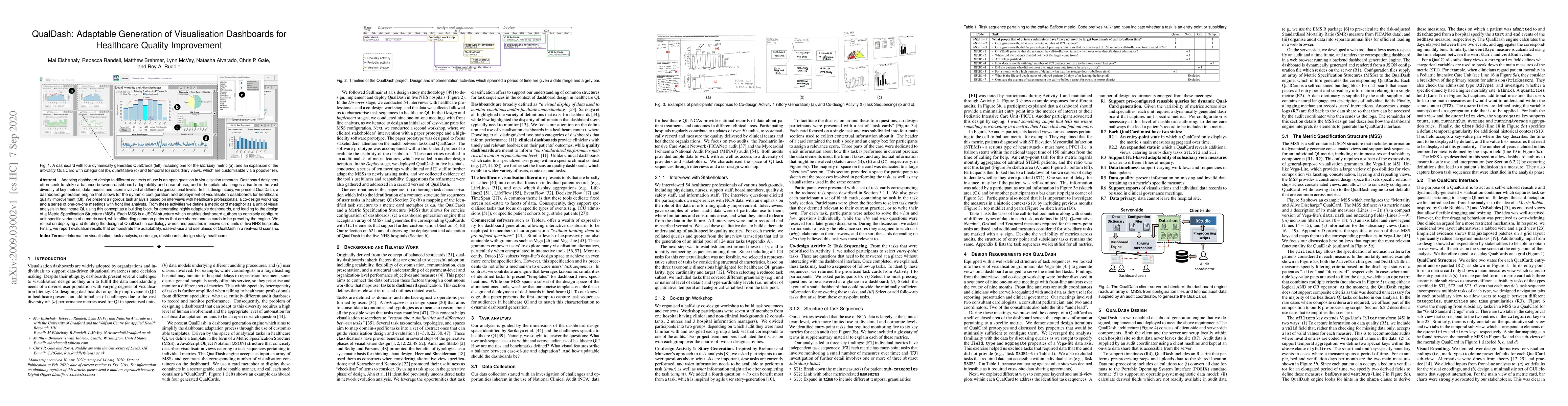 Adapting dashboard design to different contexts of use is an open question in visualisation research. Dashboard designers often seek to strike a balance between dashboard adaptability and ease-of-use, and in hospitals challenges arise from the vast diversity of key metrics, data models and users involved at different organizational levels. In this design study, we present QualDash, a dashboard generation engine that allows for the dynamic configuration and deployment of visualisation dashboards for healthcare quality improvement (QI). We present a rigorous task analysis based on interviews with healthcare professionals, a co-design workshop and a series of one-on-one meetings with front line analysts. From these activities we define a metric card metaphor as a unit of visual analysis in healthcare QI, using this concept as a building block for generating highly adaptable dashboards, and leading to the design of a Metric Specification Structure (MSS). Each MSS is a JSON structure which enables dashboard authors to concisely configure unit-specific variants of a metric card, while offloading common patterns that are shared across cards to be preset by the engine. We reflect on deploying and iterating the design of QualDash in cardiology wards and pediatric intensive care units of five NHS hospitals. Finally, we report evaluation results that demonstrate the adaptability, ease-of-use and usefulness of QualDash in a real-world scenario.