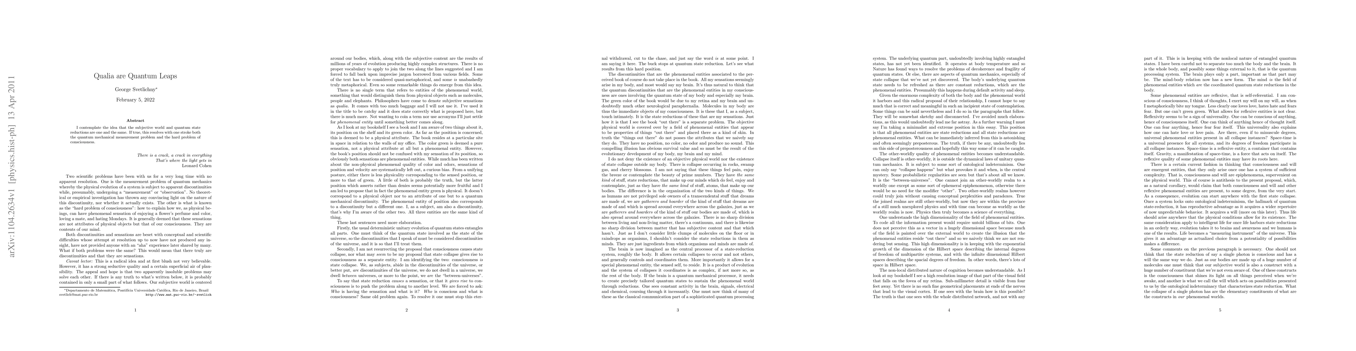 I contemplate the idea that the subjective world and quantum state reductions are one and the same. If true, this resolves with one stroke both the quantum mechanical measurement problem and the hard problem of consciousness.
