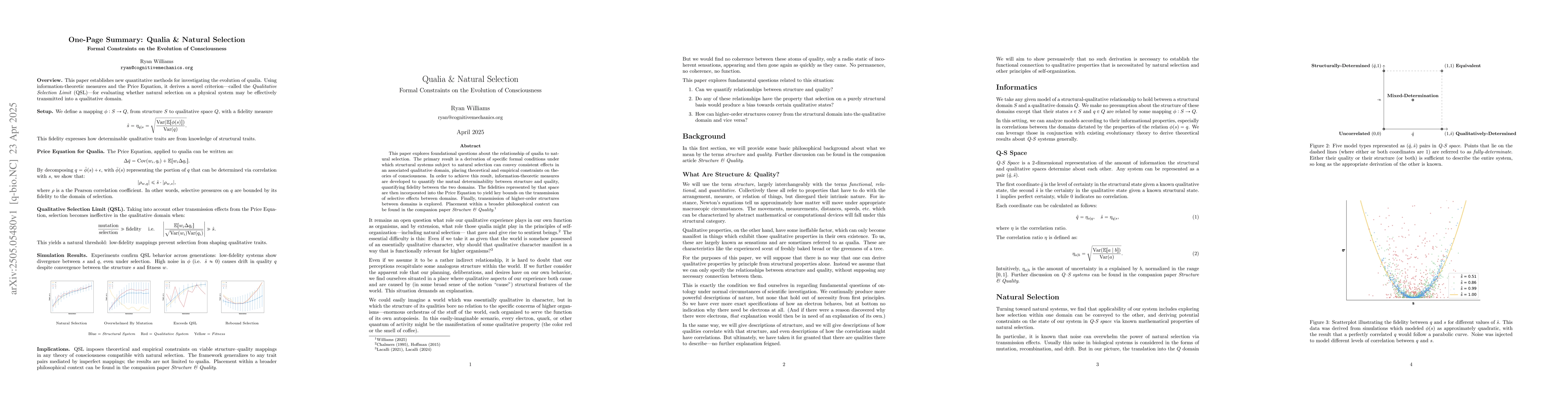 This paper explores foundational questions about the relationship of qualia to natural selection. The primary result is a derivation of specific formal conditions under which structural systems subject to natural selection can convey consistent effects in an associated qualitative domain, placing theoretical and empirical constraints on theories of consciousness. In order to achieve this result, information-theoretic measures are developed to quantify the mutual determinability between structure and quality, quantifying fidelity between the two domains. The fidelities represented by that space are then incorporated into the Price Equation to yield key bounds on the transmission of selective effects between domains. Finally, transmission of higher-order structures between domains is explored. Placement within a broader philosophical context can be found in the companion paper Structure & Quality.