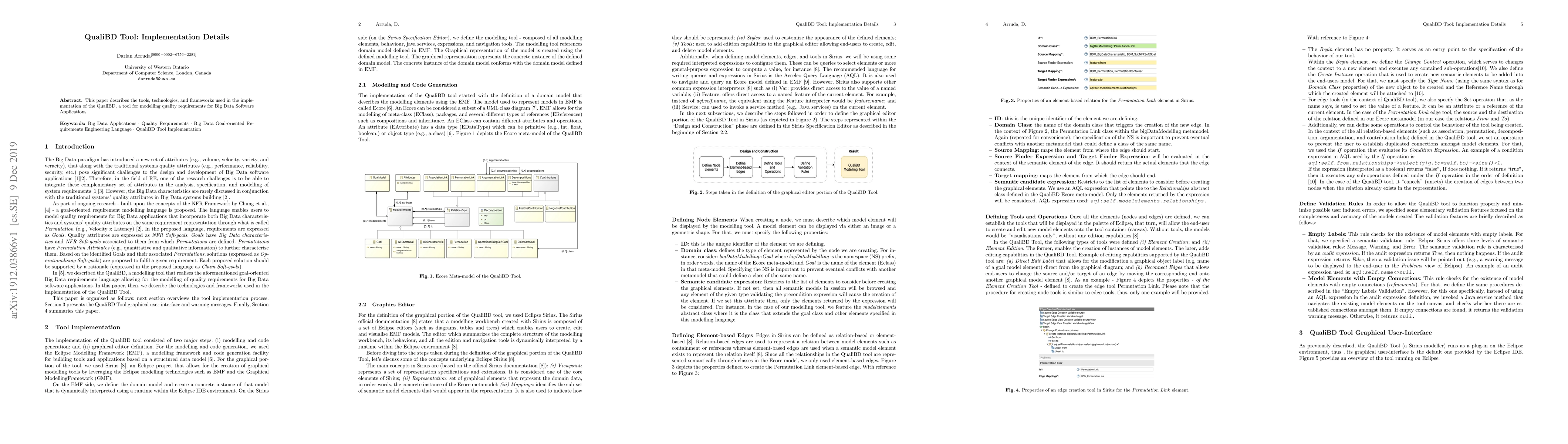 This paper describes the tools, technologies, and frameworks used in the implementation of the QualiBD, a tool for modelling quality requirements for Big Data Software Applications.