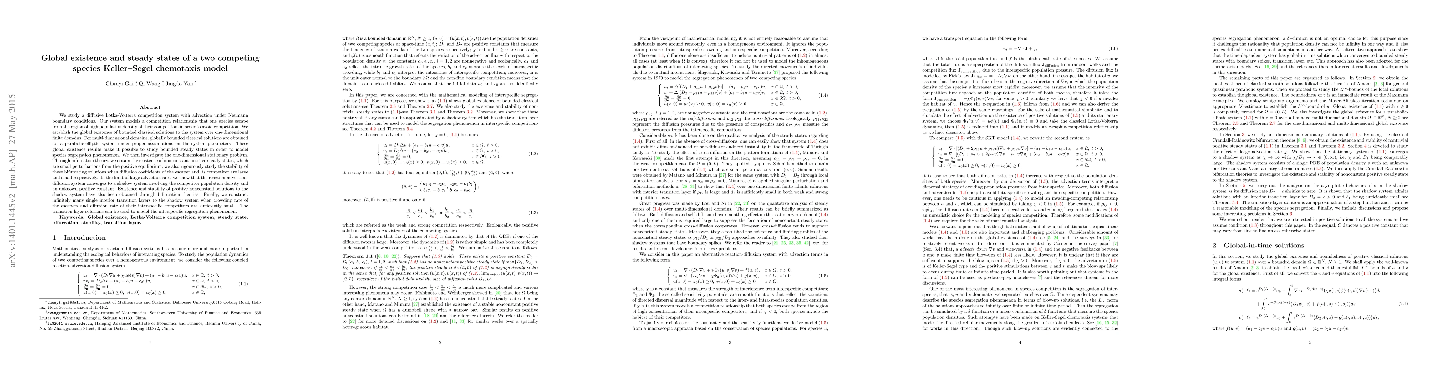 Researchers studied a competition system with advection, finding global existence of bounded solutions for steady states in one- and multi-dimensional domains. They also discovered the existence of nonconstant positive steady states and transition-layer solutions that model species segregation.