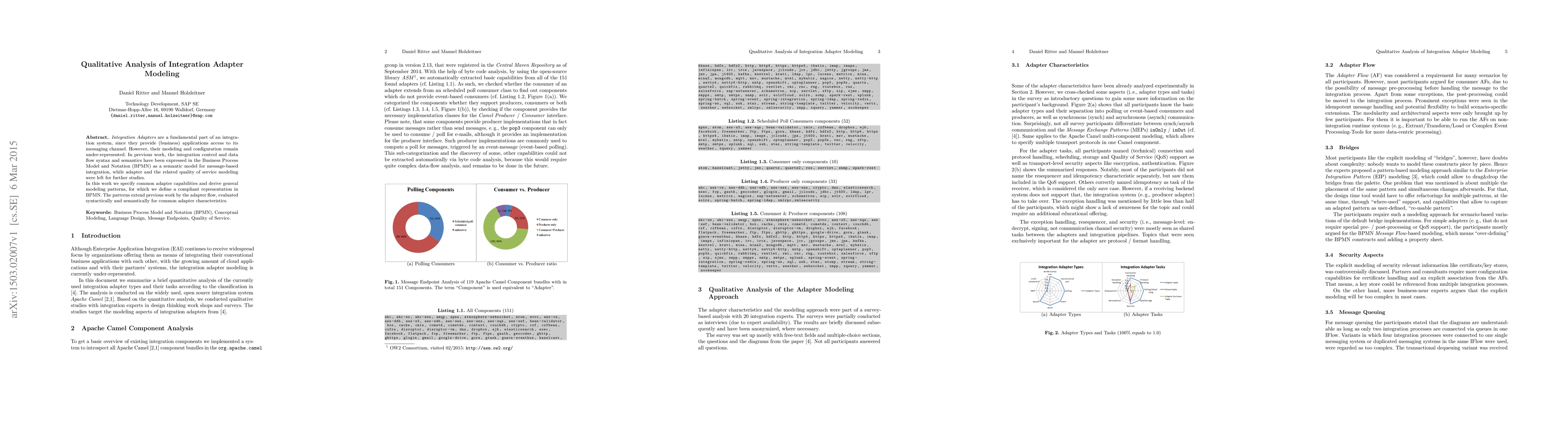 Integration Adapters are a fundamental part of an integration system, since they provide (business) applications access to its messaging channel. However, their modeling and configuration remain under-represented. In previous work, the integration control and data flow syntax and semantics have been expressed in the Business Process Model and Notation (BPMN) as a semantic model for message-based integration, while adapter and the related quality of service modeling were left for further studies. In this work we specify common adapter capabilities and derive general modeling patterns, for which we define a compliant representation in BPMN. The patterns extend previous work by the adapter flow, evaluated syntactically and semantically for common adapter characteristics.