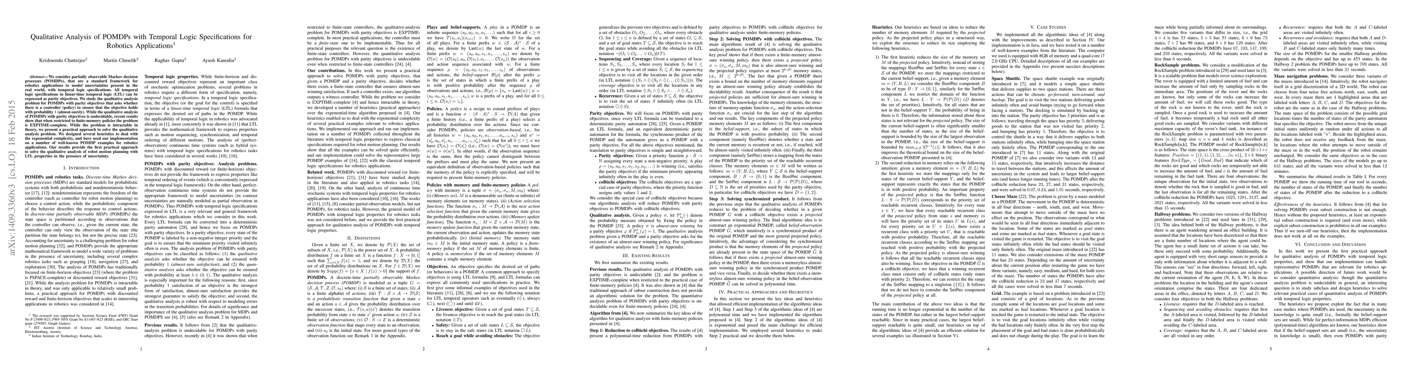 This paper explores the qualitative analysis of POMDPs with temporal logic specifications, specifically focusing on LTL and parity objectives. It presents practical heuristics to address the EXPTIME-complete problem of determining if a policy exists to ensure objectives almost surely, demonstrating their effectiveness on robotics applications.