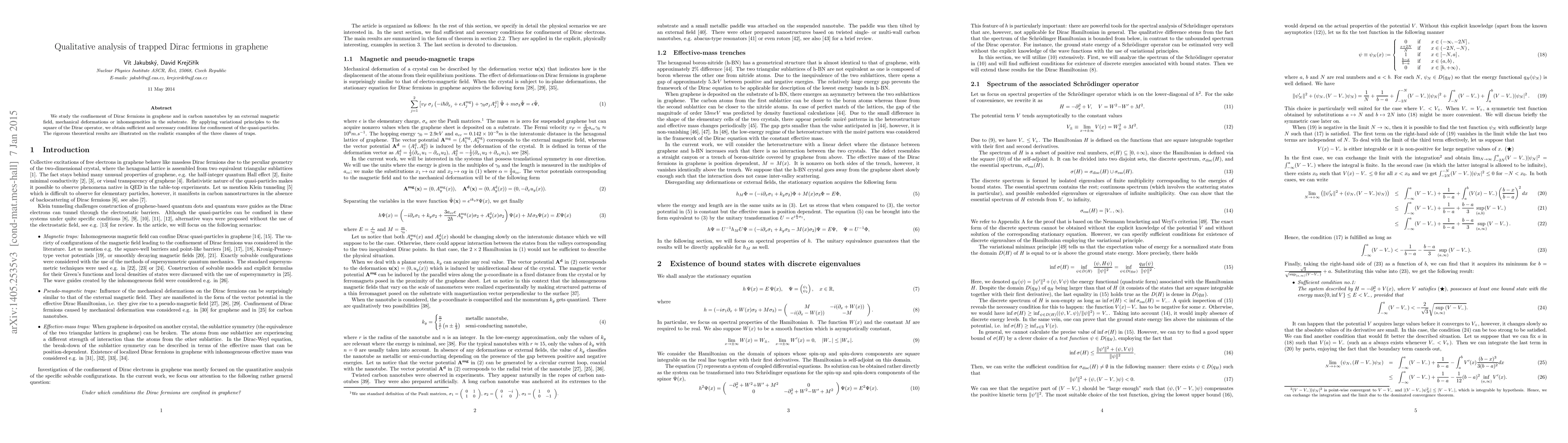 We study the confinement of Dirac fermions in graphene and in carbon nanotubes by an external magnetic field, mechanical deformations or inhomogeneities in the substrate. By applying variational principles to the square of the Dirac operator, we obtain sufficient and necessary conditions for confinement of the quasi-particles. The rigorous theoretical results are illustrated on the realistic examples of the three classes of traps.