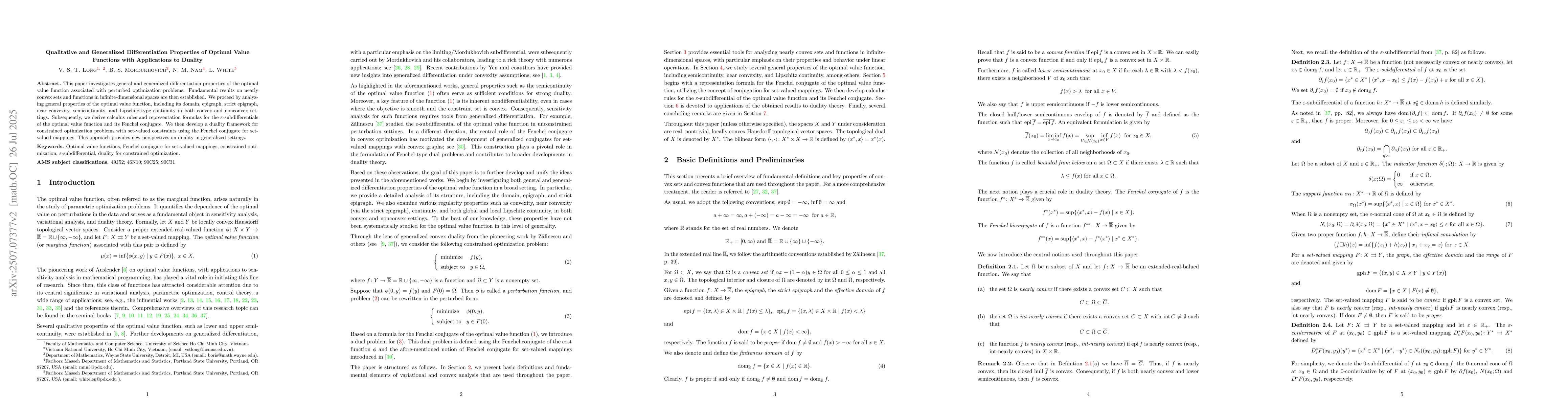 In this paper, we investigate general and generalized differentiation properties of theoptimal value function associated with perturbed optimization problems. We begin with a comprehensive analysis of its effective domain, epigraph, strict epigraph, convexity, near convexity, continuity, and Lipschitz-type behavior, in both convex and nonconvex settings. Next, we propose a duality framework for constrained optimization problems with set-valued constraints, based on the notion of the Fenchel conjugate for set-valued mappings, which offers new insights into duality theory in a broad context. Finally, we compute the {\epsilon}-subdifferentials of the optimal value function and its Fenchel conjugate.