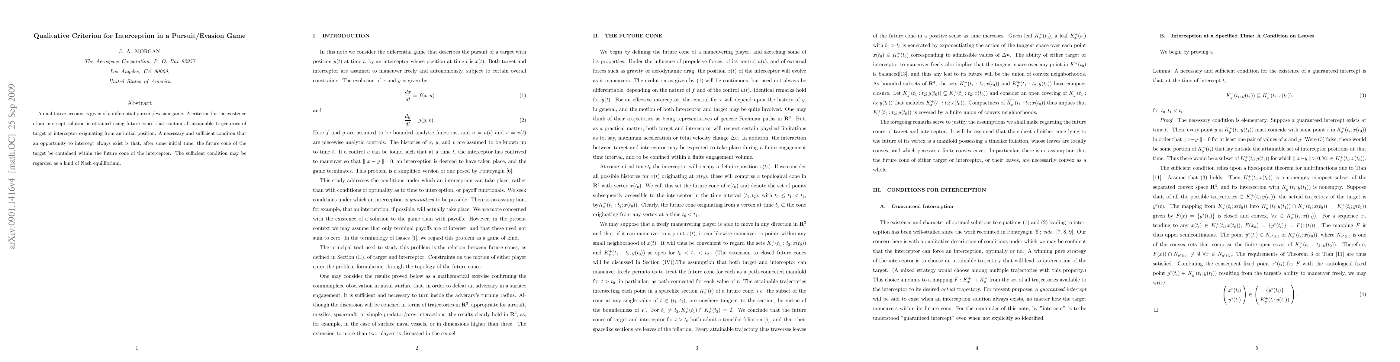 A qualitative account is given of a differential pursuit/evasion game. A criterion for the existence of an intercept solution is obtained using future cones that contain all attainable trajectories of target or interceptor originating from an initial position. A sufficient and necessary conditon that an opportunity to intercept always exist is that, after some initial time, the future cone of the target be contained within the future cone of the interceptor. The sufficient condition may be regarded as a kind of Nash equillibrium.