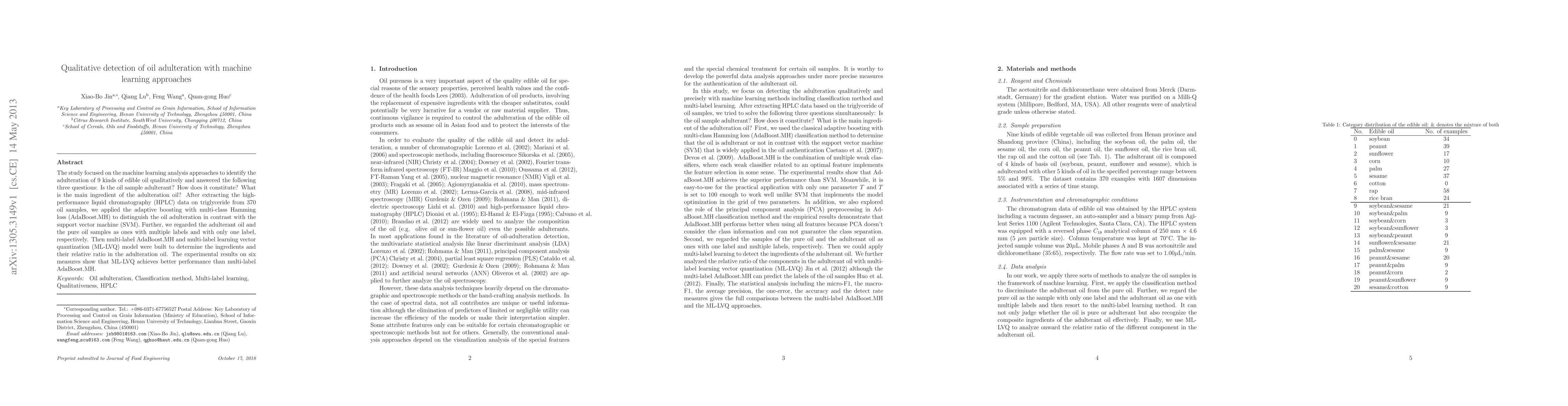 This study employs machine learning techniques to qualitatively detect adulteration in nine types of edible oils using HPLC data. The adaptive boosting method with multi-class Hamming loss (AdaBoost.MH) and multi-label learning vector quantization (ML-LVQ) were used to identify adulterants and determine their composition, with ML-LVQ showing superior performance.