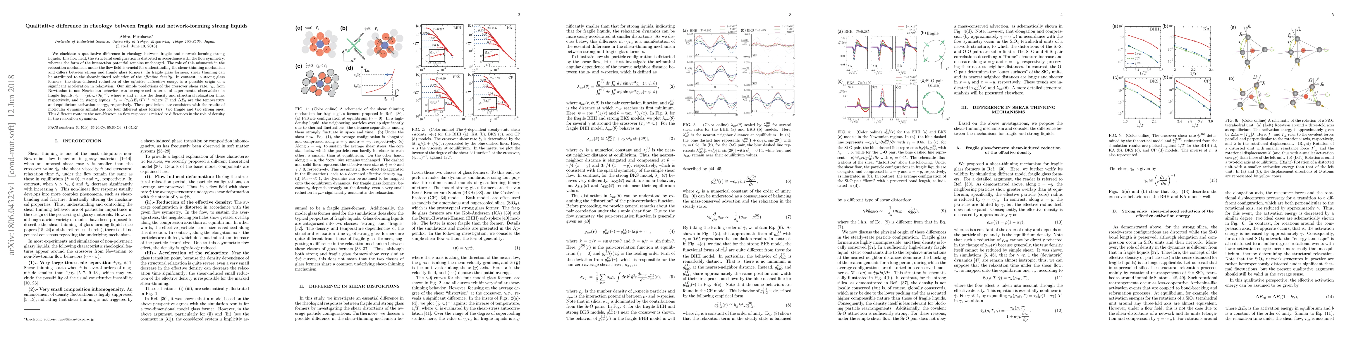 This paper identifies a qualitative rheological difference between fragile and network-forming strong liquids, showing that shear-thinning in fragile liquids is due to reduced effective density, while in strong liquids, it results from reduced effective activation energy. Predictions for crossover shear rates differ between the two types, providing insights into their distinct relaxation mechanisms.