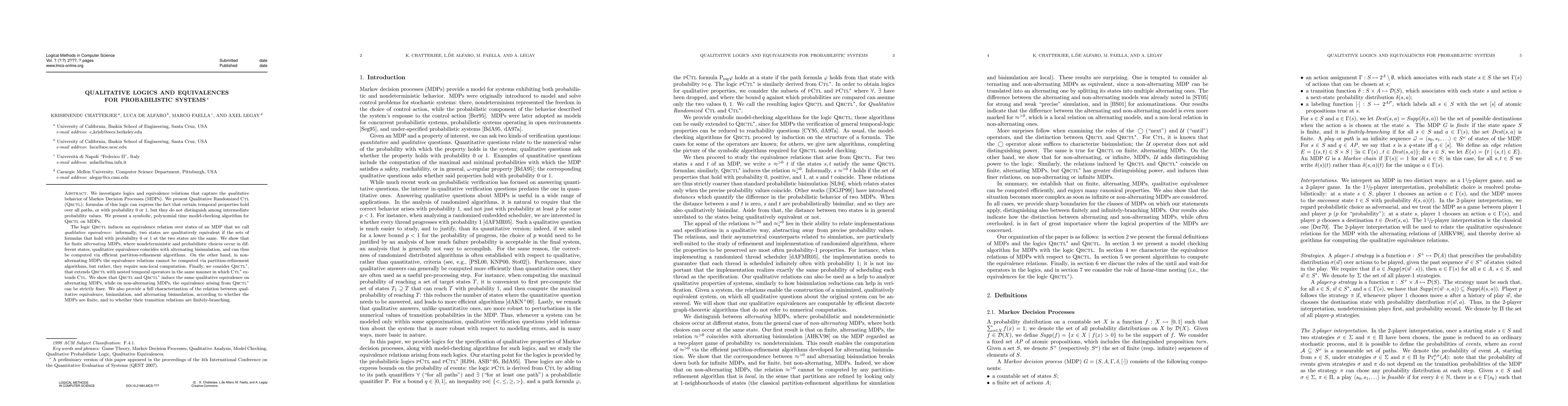 This research introduces Qualitative Randomized CTL (QRCTL), a logic for expressing temporal properties in Markov Decision Processes (MDPs) without distinguishing between intermediate probability values. It presents a polynomial-time model-checking algorithm for QRCTL, and defines 'qualitative equivalence' for MDP states based on this logic. The study shows that for certain MDP types, this equivalence aligns with alternating bisimulation, enabling efficient computation via partition-refinement algorithms. However, in other MDP types, computation requires non-local methods. The paper also explores QRCTL* extending QRCTL with nested temporal operators, finding that while both induce the same equivalence in alternating MDPs, QRCTL*'s equivalence can be finer in non-alternating MDPs. The research provides a comprehensive characterization of the relationship between qualitative equivalence, bisimulation, and alternating bisimulation in finite and finitely-branching MDPs.
