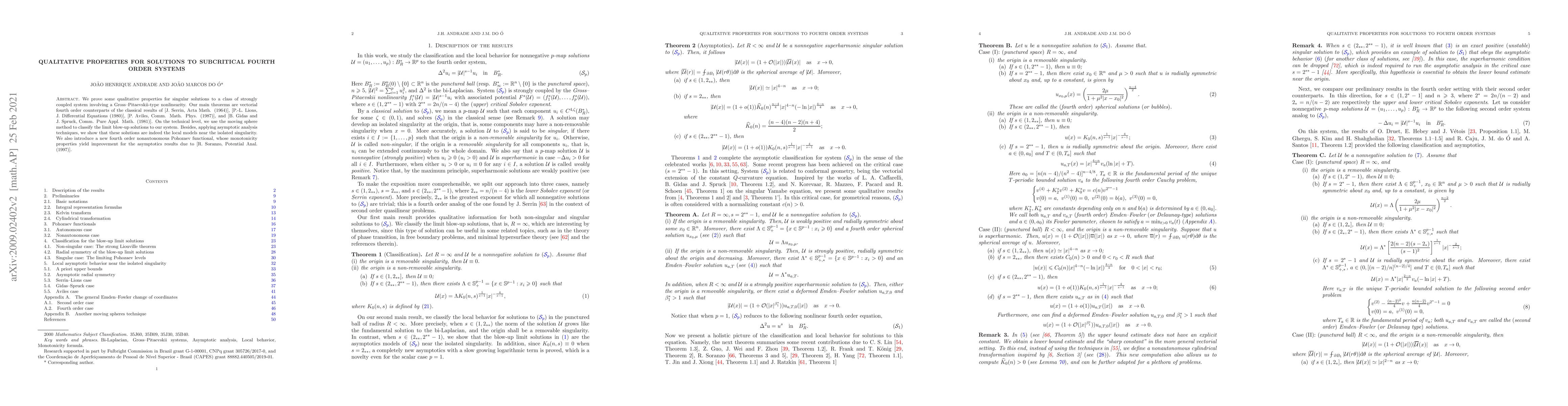 Researchers prove qualitative properties for solutions to subcritical fourth-order systems, including existence, uniqueness, and asymptotic behavior of singular solutions using the moving sphere method and Pohozaev functional analysis.